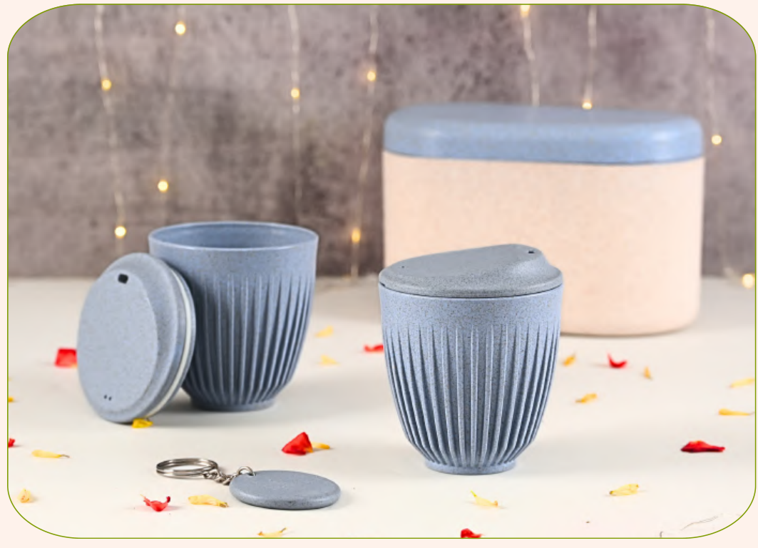 Eco-friendly coffee cup set made from wheat straw, perfect for on-the-go beverages. Includes a matching lid and a convenient keychain for portability. Durable and reusable, this set promotes sustainable living.