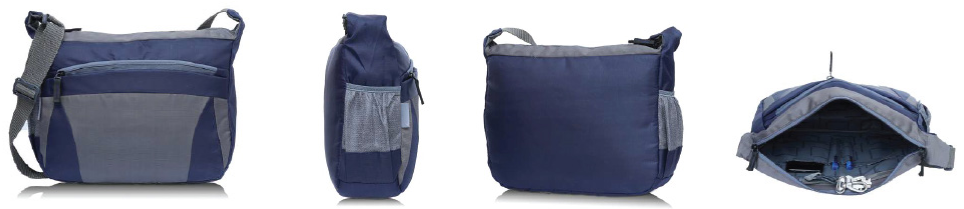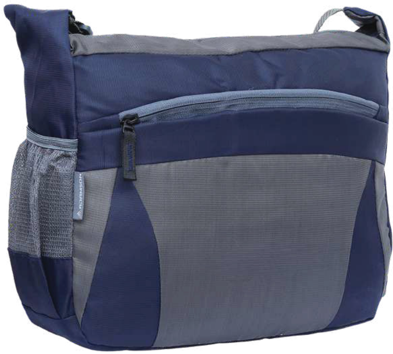 This practical crossbody messenger bag features a durable navy and grey color block design. It includes a zippered main compartment and an exterior zippered pocket for easy access to essentials, along with mesh side pockets for water bottles or umbrellas.
