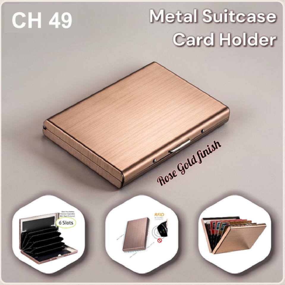 This elegant card holder features a brushed rose gold finish, designed to resemble a miniature suitcase. It offers ample storage with 6 slots to keep your cards organized and protected. The compact design makes it perfect for everyday use or travel.