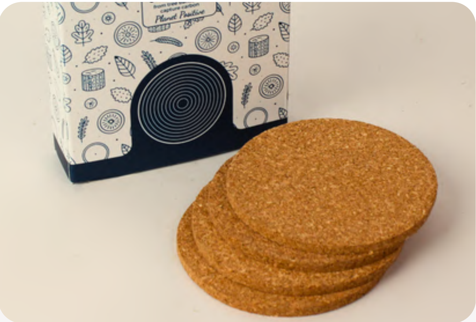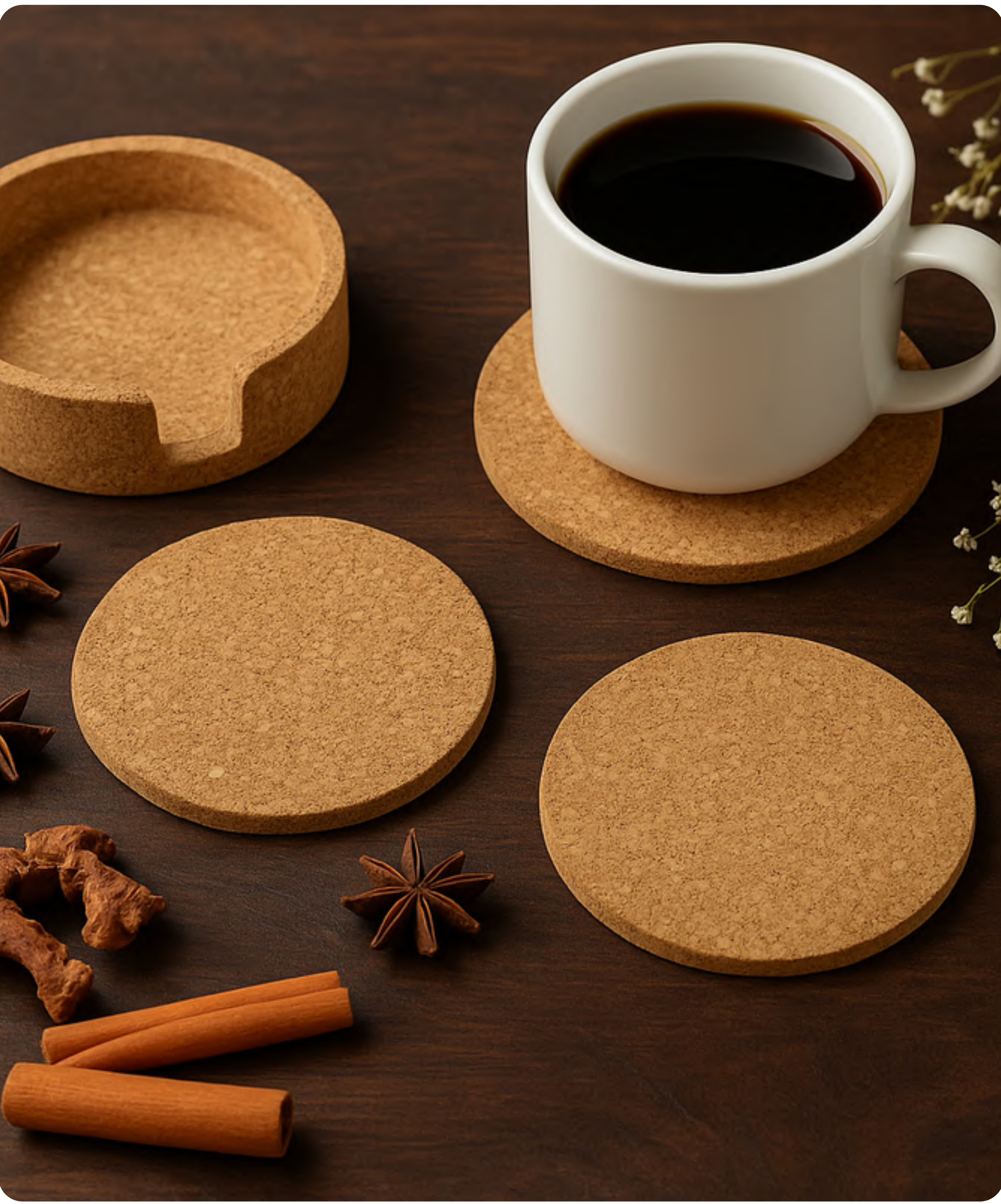 Protect your surfaces with this set of round cork coasters. The natural cork material is absorbent and durable, perfect for everyday use. They come in a decorative box featuring a charming botanical print, making them a great addition to your home or a thoughtful gift.