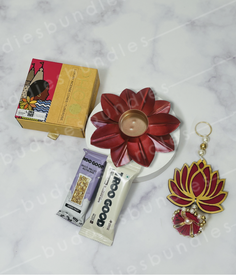 Includes a copper diya, lotus wall hanging, phool dhoop cone box, snacks, and celebration note in a rigid box.