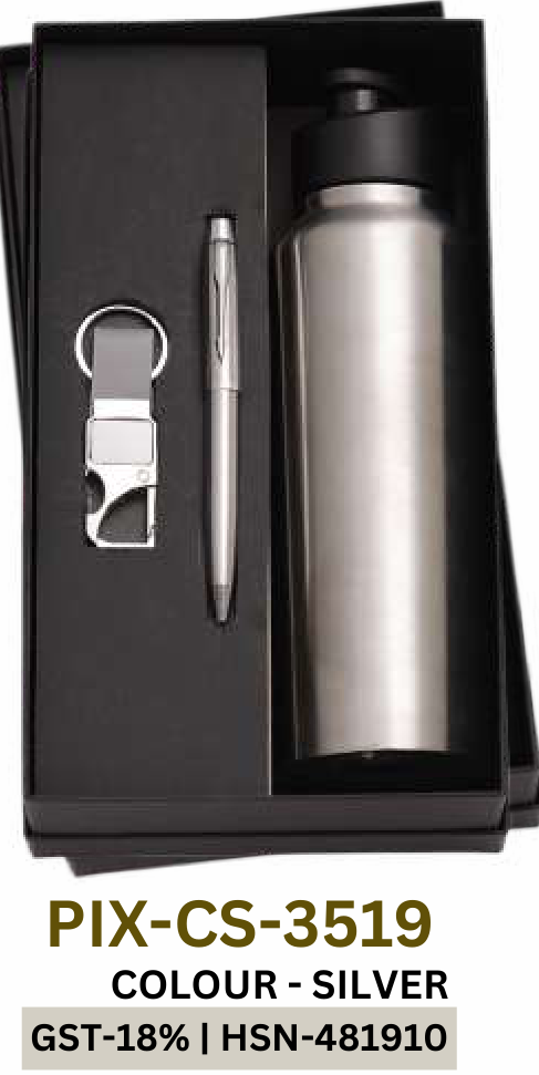 This elegant gift set includes a sleek silver pen, a multi-functional keychain with a bottle opener, and a durable silver water bottle. Perfect for corporate gifting or personal use, it offers practicality and style.