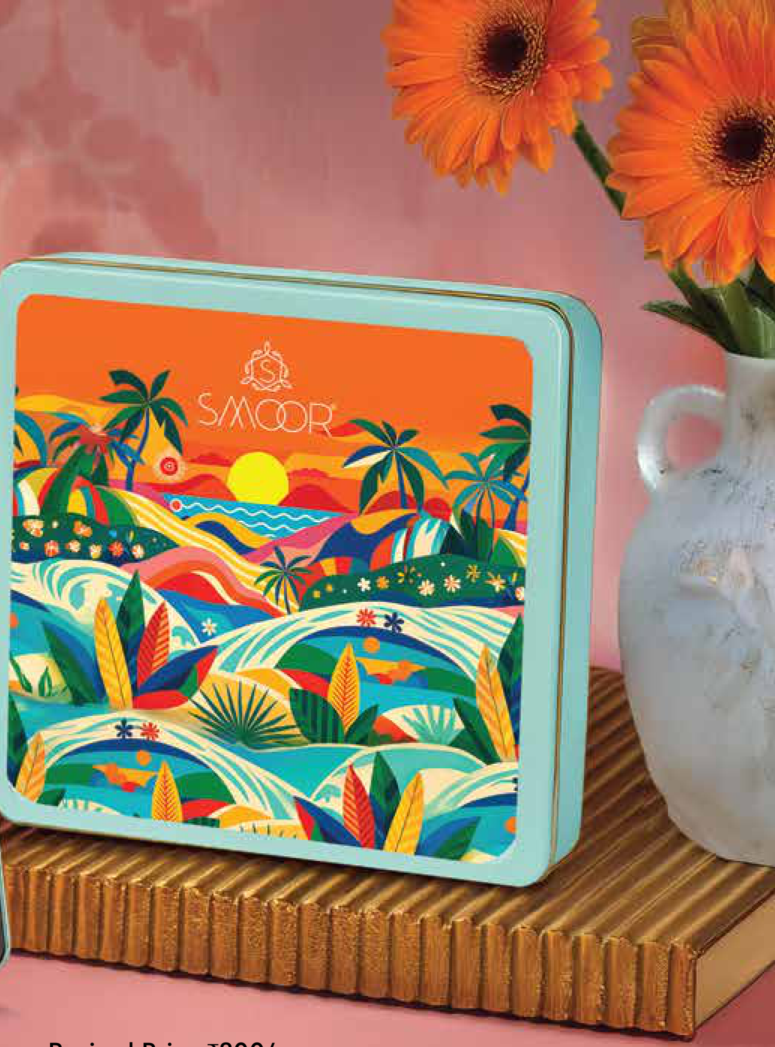 This decorative tin box features a vibrant tropical landscape design with palm trees, a sunset, and colorful waves. Its durable construction and eye-catching artwork make it a perfect addition to any home or as a thoughtful gift.