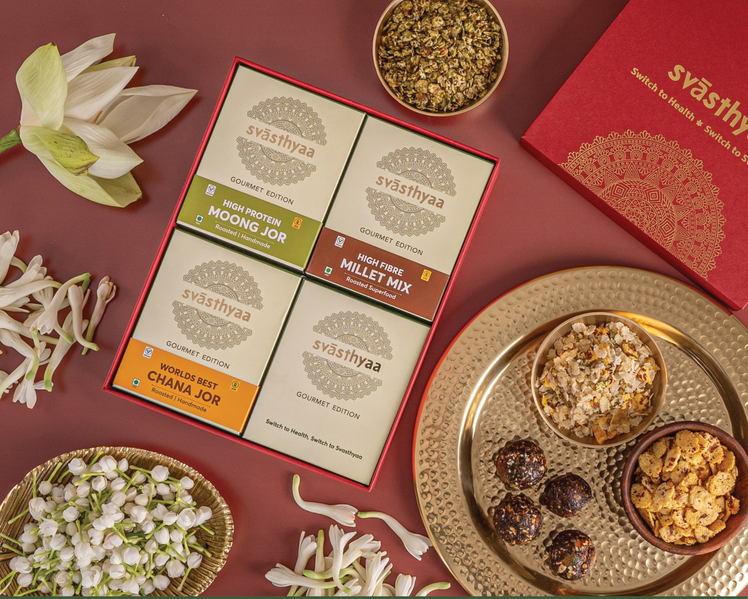 A curated selection of gourmet snacks from Svasthyaa, featuring high-protein Moong Jor, fiber-rich Millet Mix, and the 'World's Best' Chana Jor. These roasted and handmade delights are perfect for a healthy and flavorful snacking experience.
