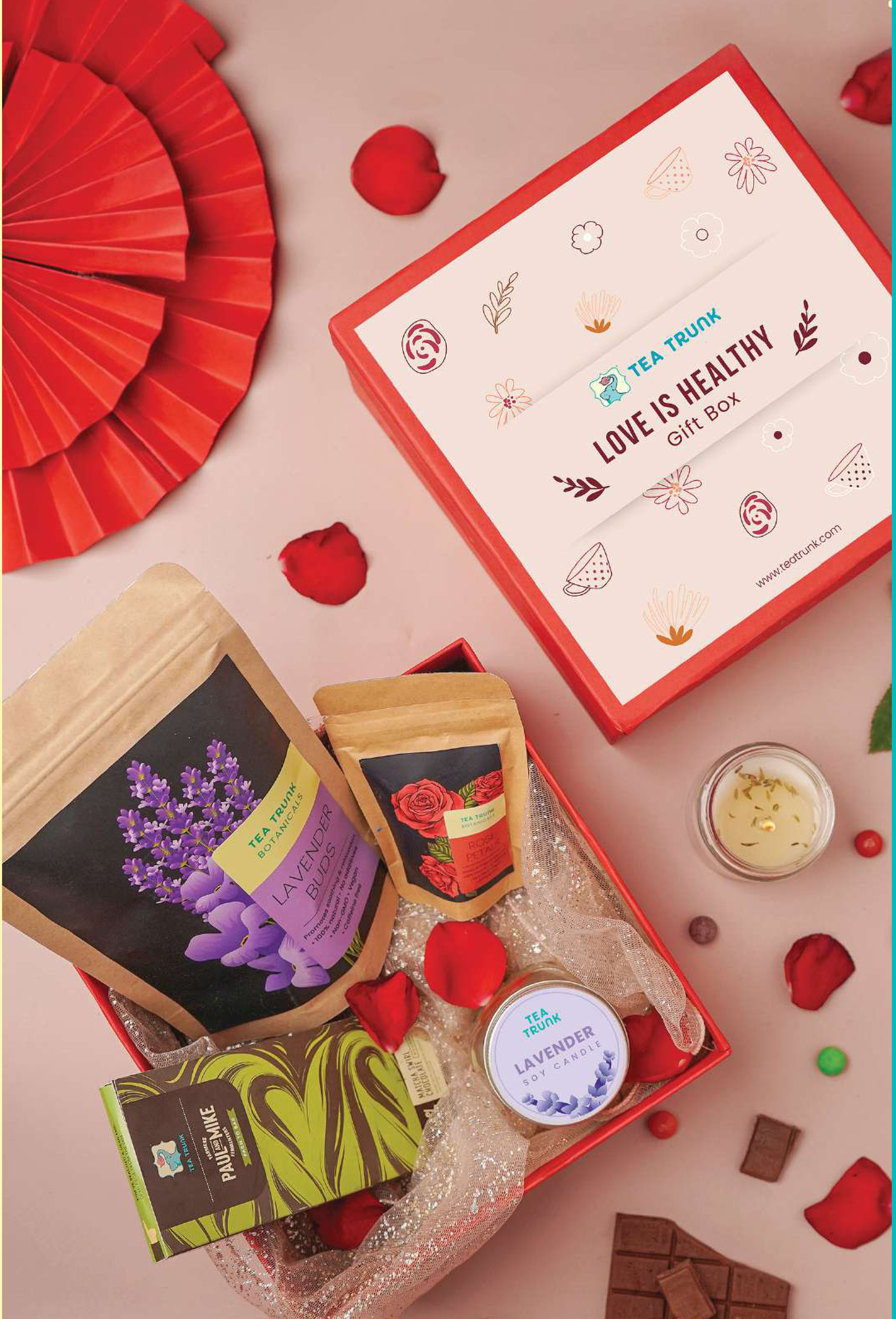 A curated gift box from Tea Trunk featuring a selection of artisanal teas and treats. This 'Love is Healthy' box is perfect for gifting to loved ones who appreciate wellness and fine flavors. It includes soothing lavender buds, fragrant rose petals, and a delightful matcha swirl chocolate.