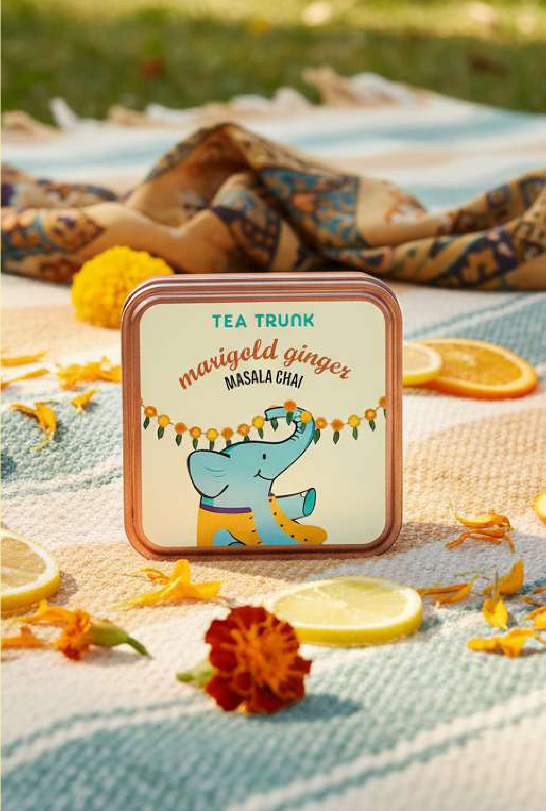 Experience the vibrant flavors of Marigold Ginger Masala Chai from Tea Trunk. This delightful blend comes in a charming tin featuring a playful elephant design, perfect for adding a touch of joy to your tea ritual. Enjoy a warming and aromatic cup.