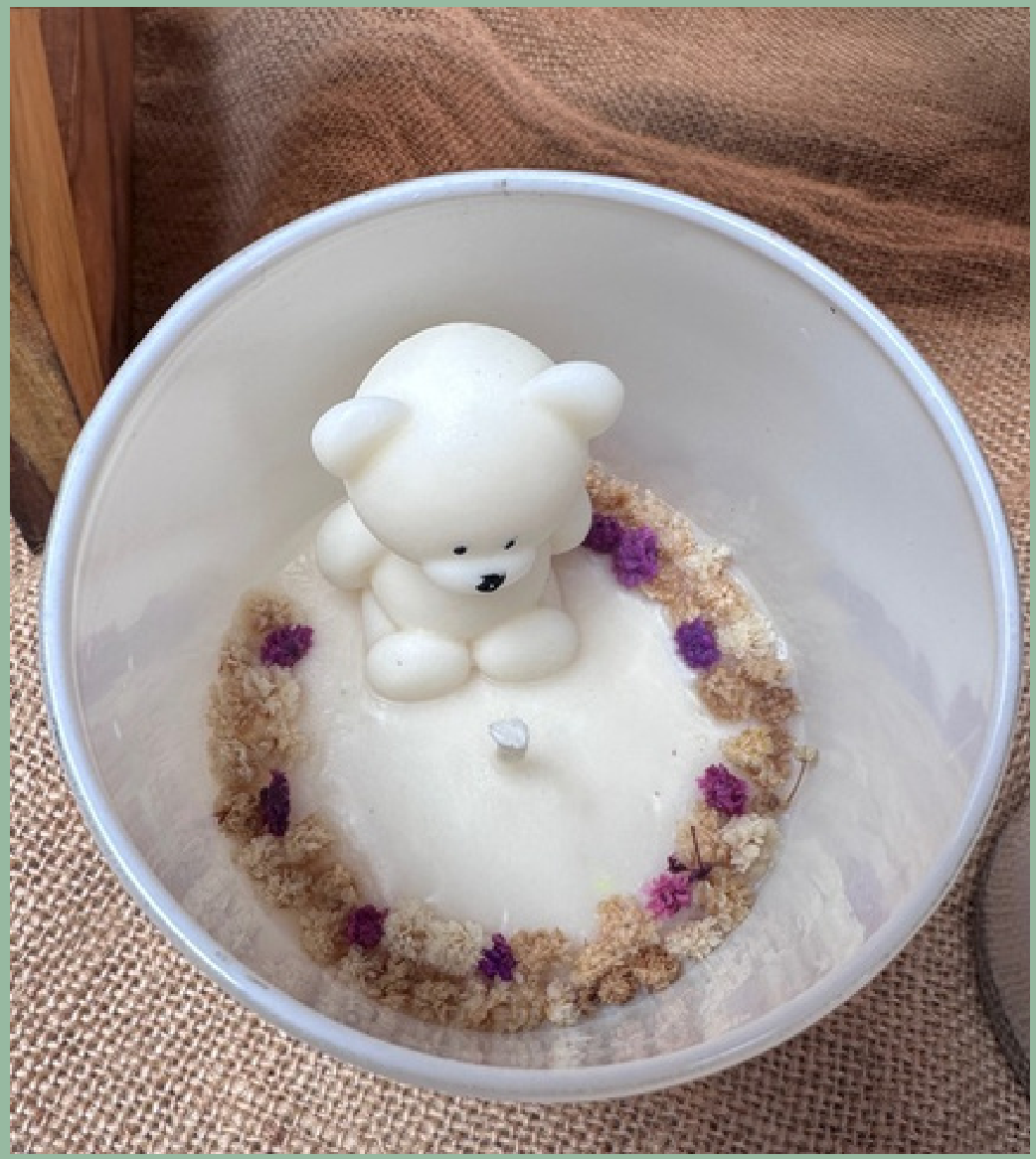 This charming scented candle features a delightful teddy bear figurine nestled amongst delicate dried flowers. Crafted with care, it adds a whimsical and aromatic touch to any space, perfect for creating a cozy ambiance.