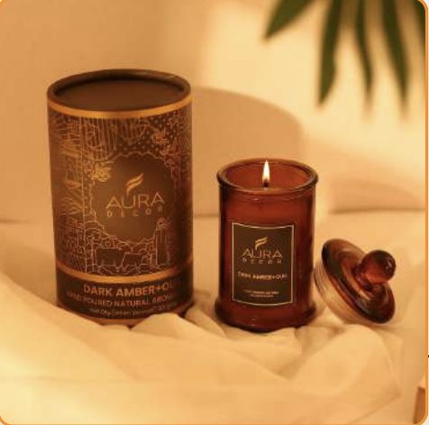 12 cm x 6 cm, 120 gm pure soya wax, available in Vanilla+Oud, Dark Amber+Oud, Rose+Oud.