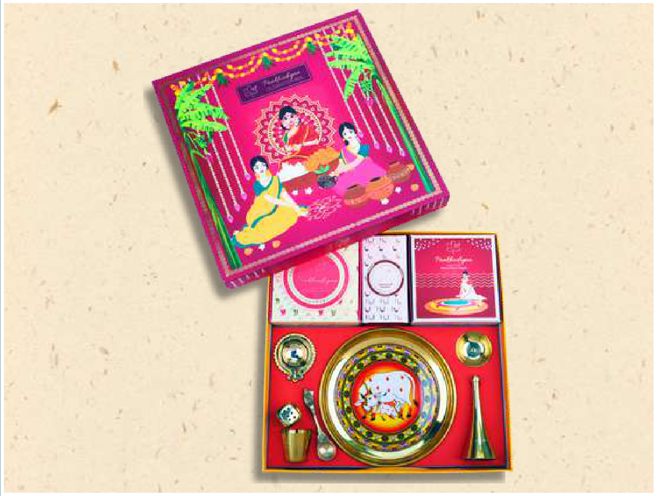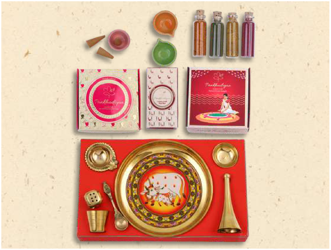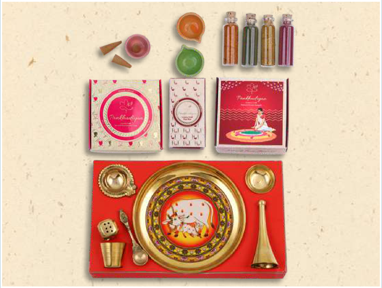 This exquisite pooja thali set is designed to enhance your spiritual rituals. It includes a beautifully decorated thali, a small bell, a diya, and other essential items, all presented in a vibrant, culturally inspired decorative box. Perfect for festivals and daily prayers.