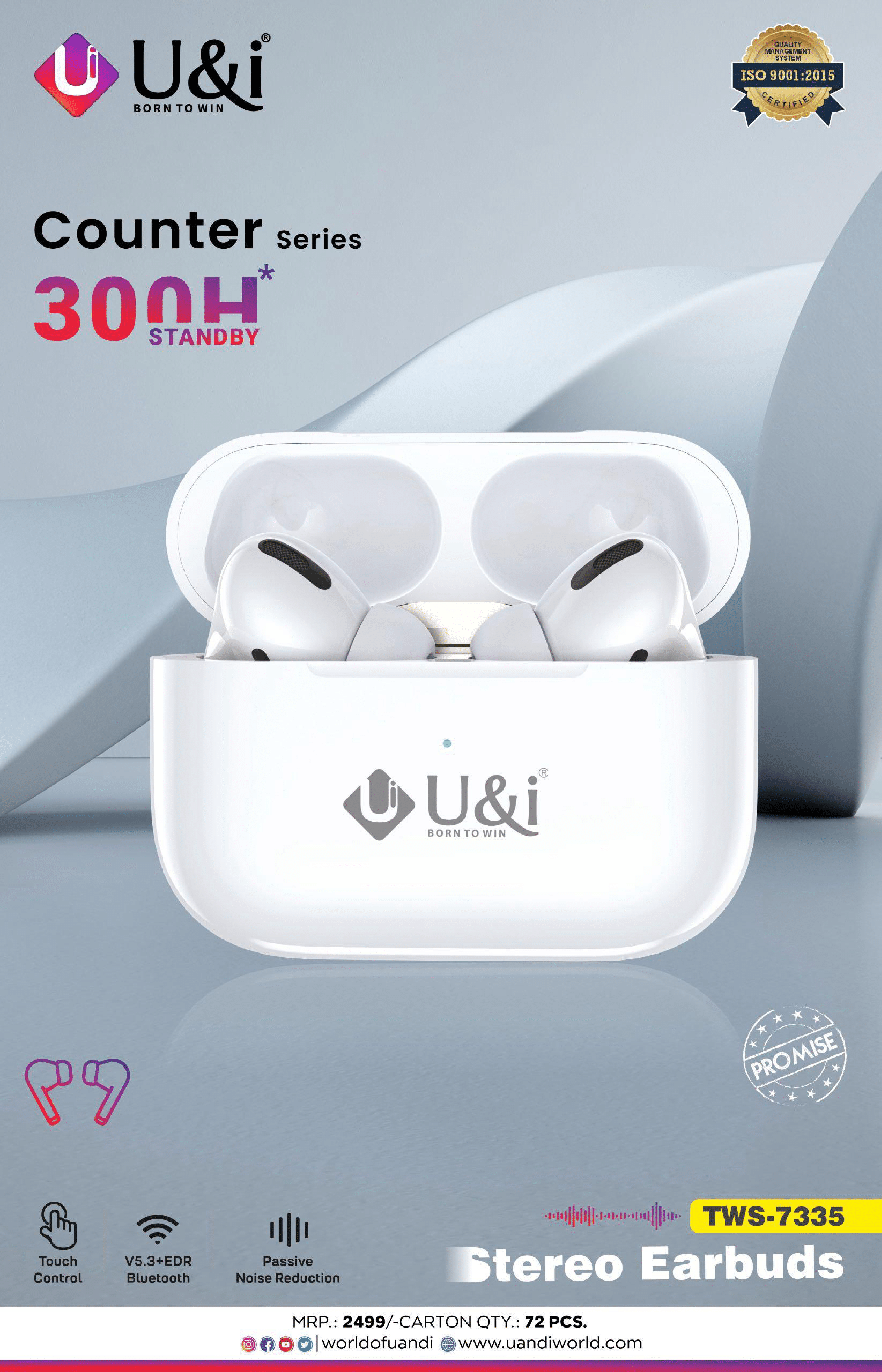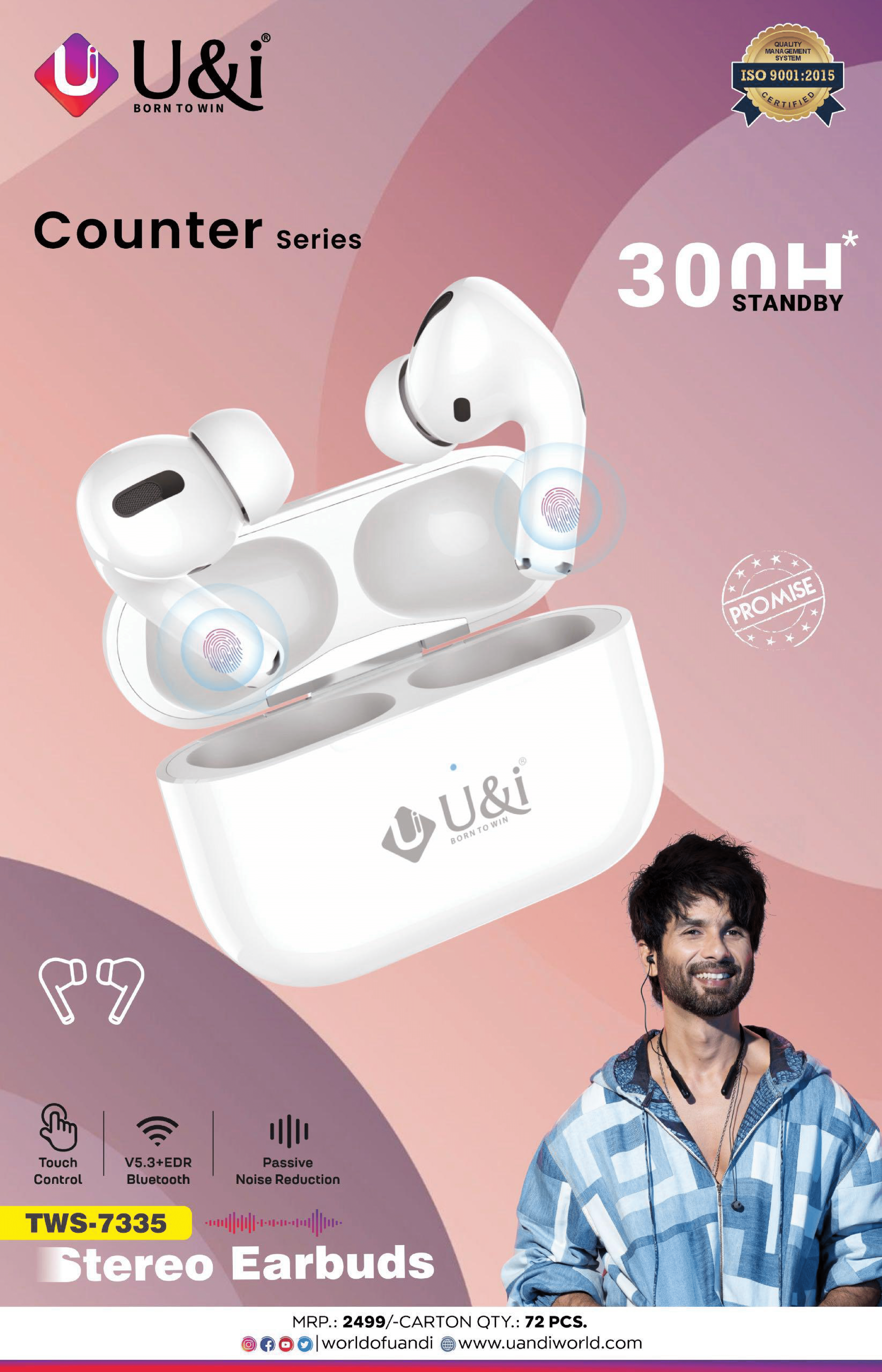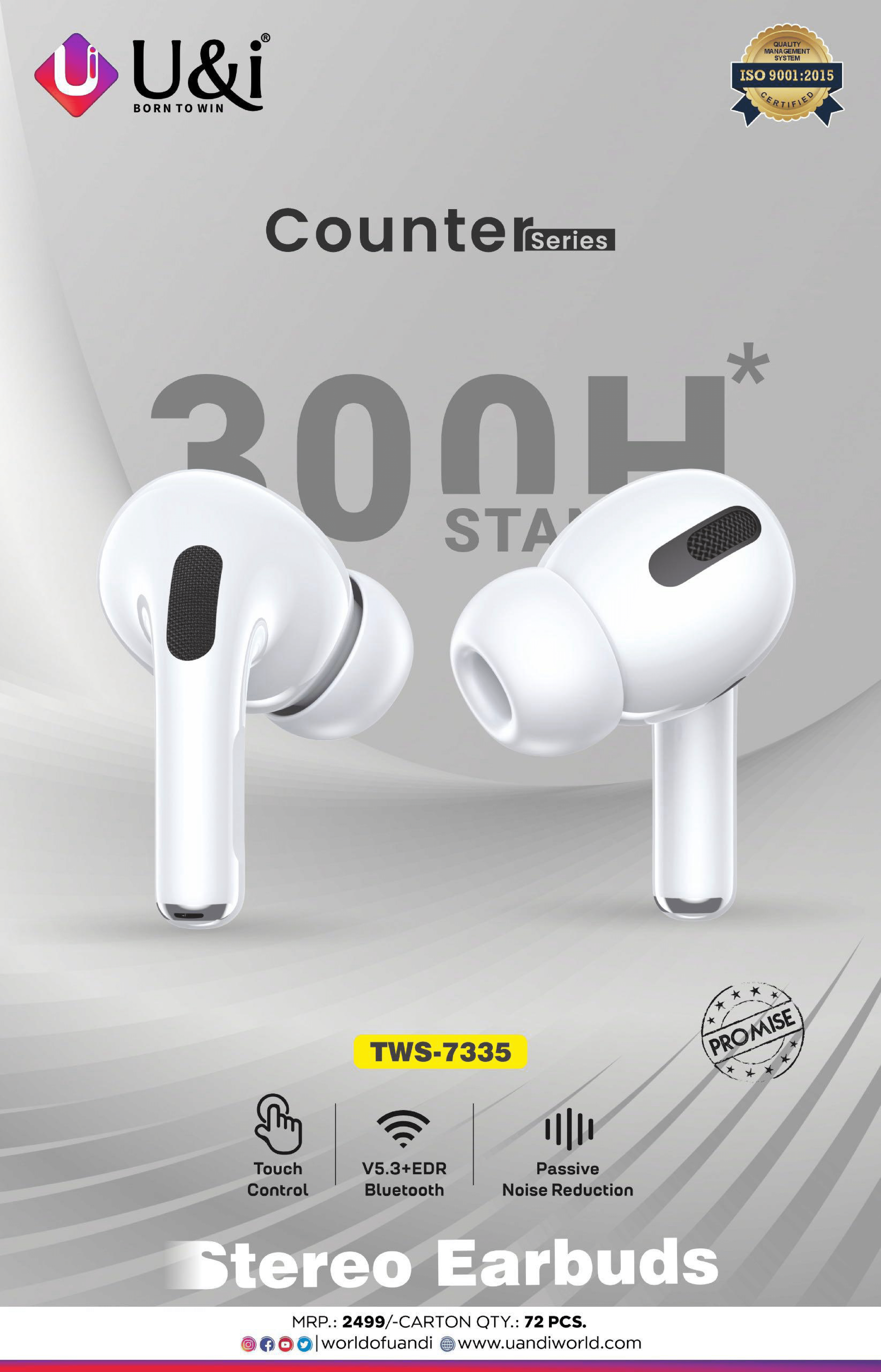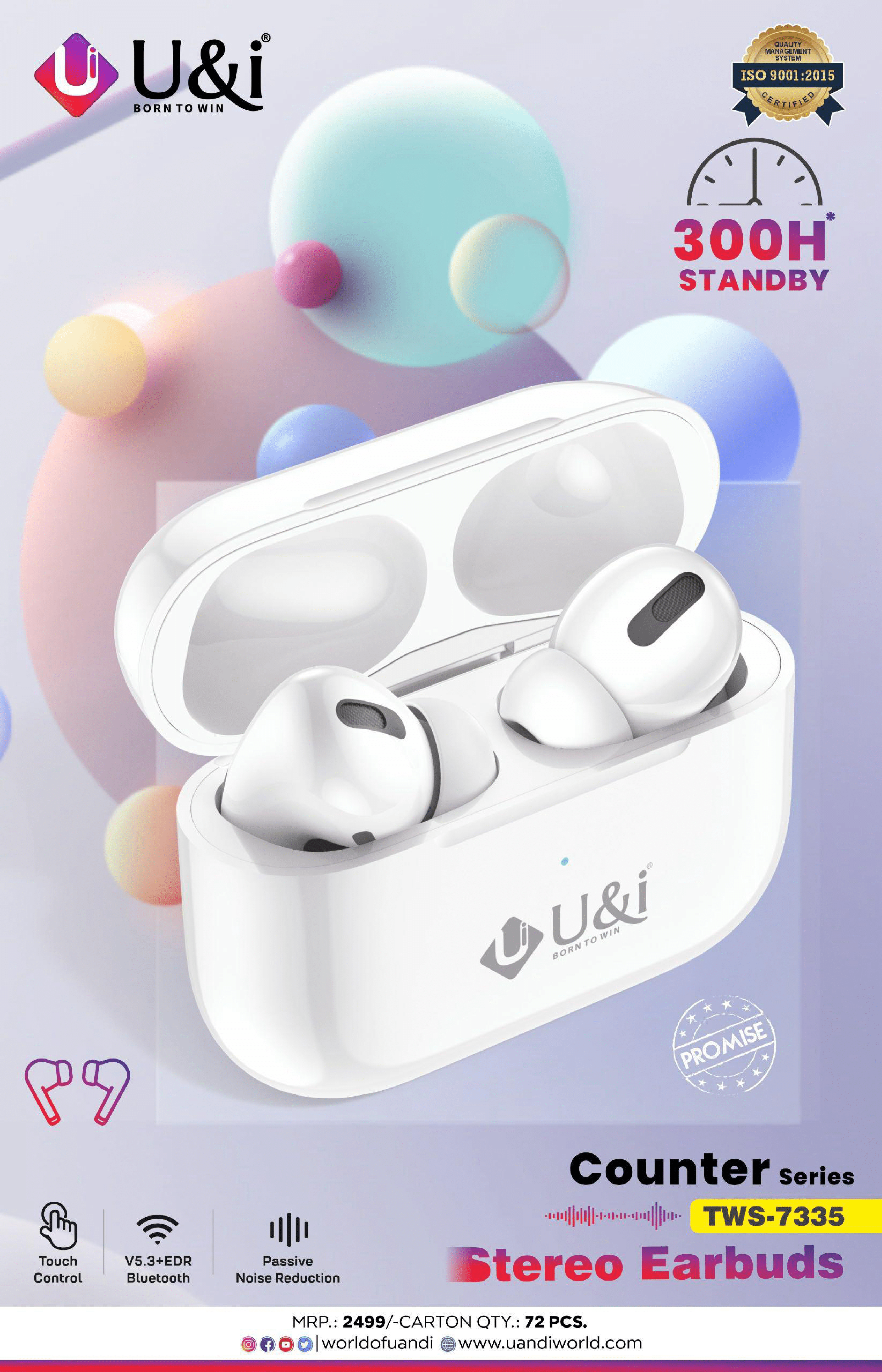 Stereo true wireless earbuds with touch controls, long standby, passive noise reduction, and Bluetooth v5.3 EDR.
