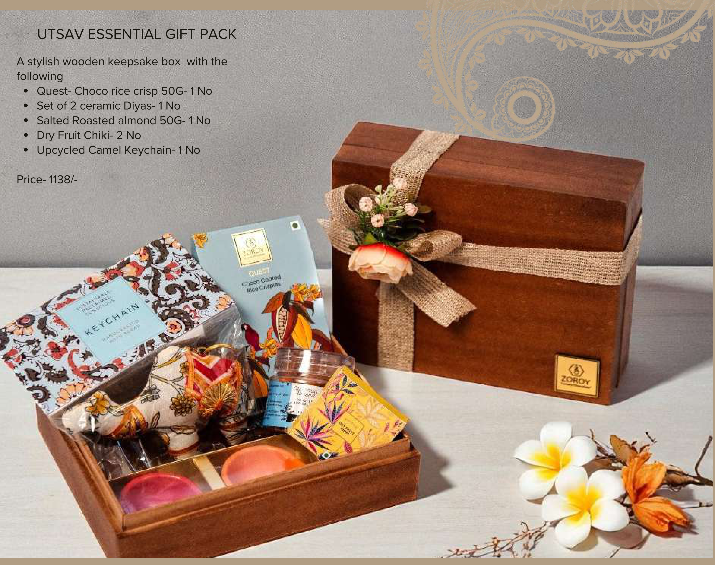 This Utsav Essential Gift Pack features a stylish wooden keepsake box filled with a curated selection of treats. It includes Choco rice crispies, ceramic diyas, salted roasted almonds, dry fruit chiki, and an upcycled camel keychain.