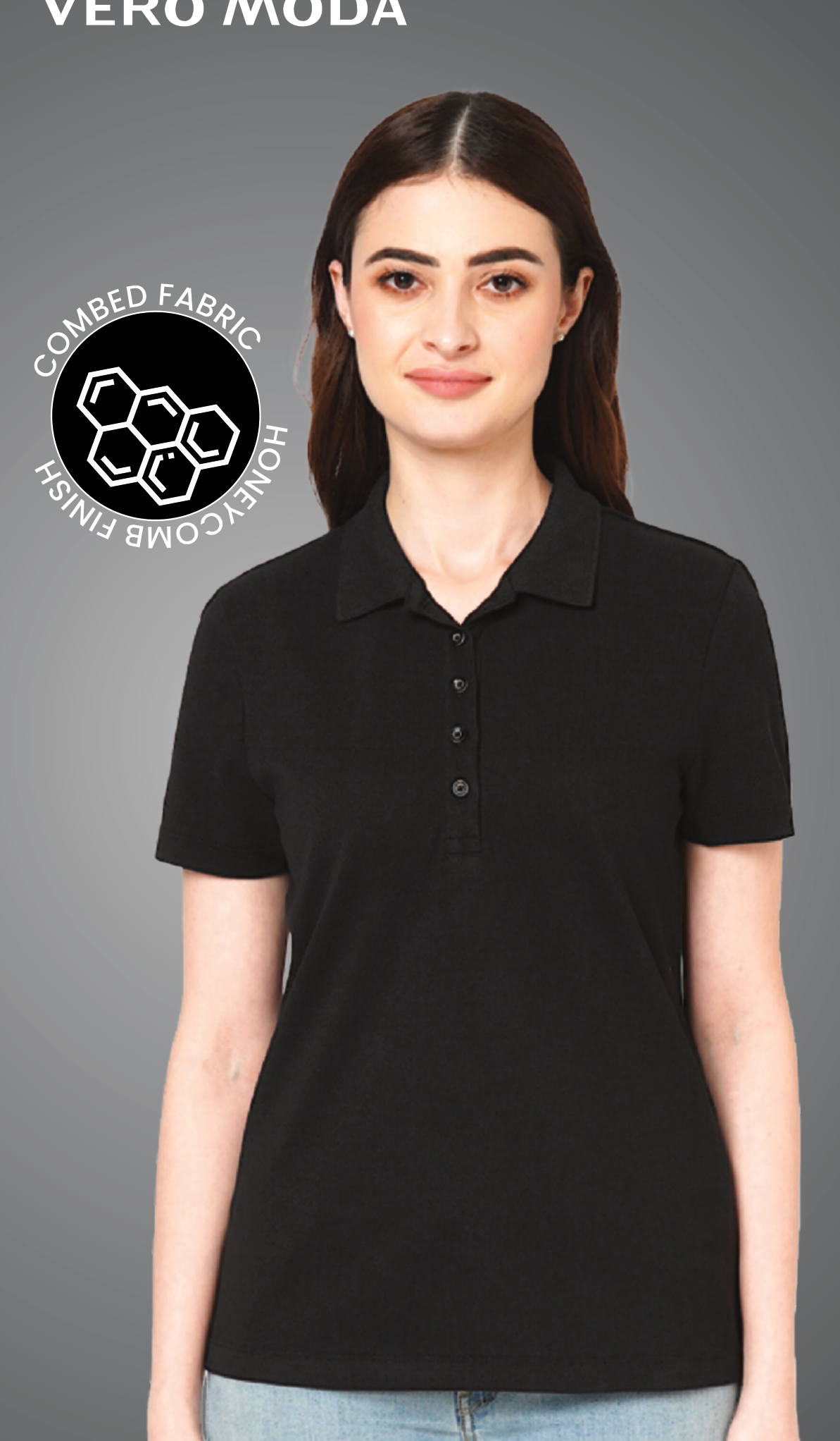 This Vero Moda polo t-shirt for women features a sophisticated black color and a unique honeycomb finish. Crafted from combed fabric, it offers a comfortable and stylish option for everyday wear.