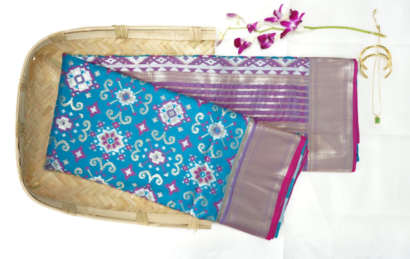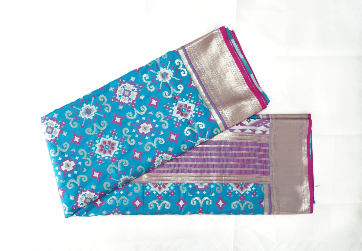 A stunning tribute to the intricate heritage of Telangana’s weaving legacy, this Vibrant Geometric Pochampally Saree features bold turquoise and magenta hues, enriched with classic Ikat geometric patterns. The saree showcases dual design zones—an electric blue body with rich silver, pink, and lavender motifs, and a contrasting magenta pallu adorned with diamond floral grids, offering a beautiful textural harmony.