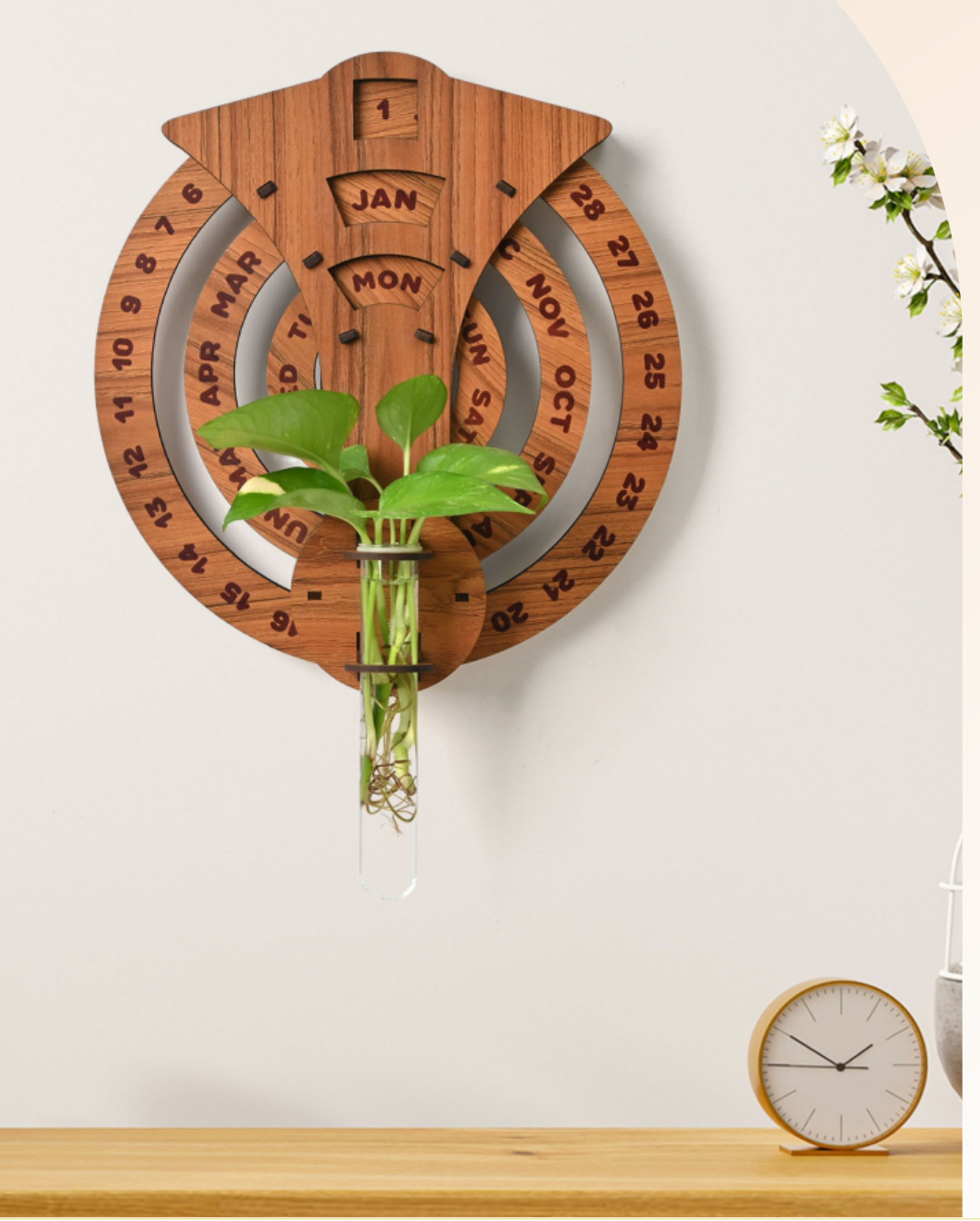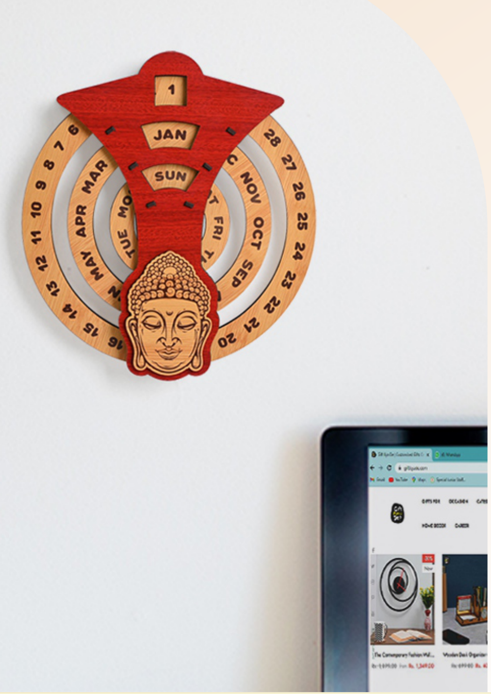 This unique wooden perpetual calendar features a serene Buddha face and a rotating mechanism to display the date, month, and day. Crafted from natural wood with a vibrant red accent, it adds a touch of tranquility and mindfulness to any space. It's a functional piece of art that never needs replacing.