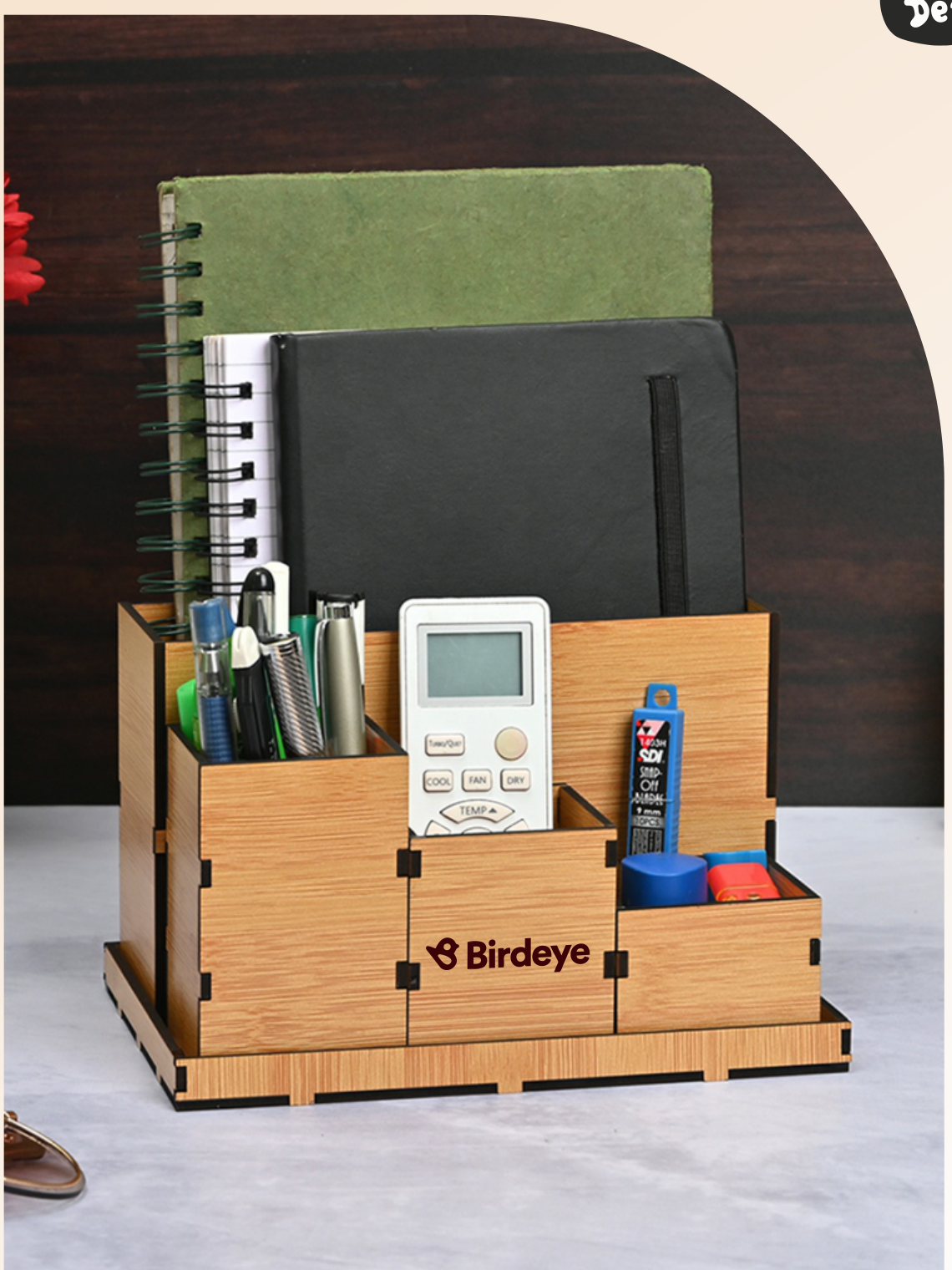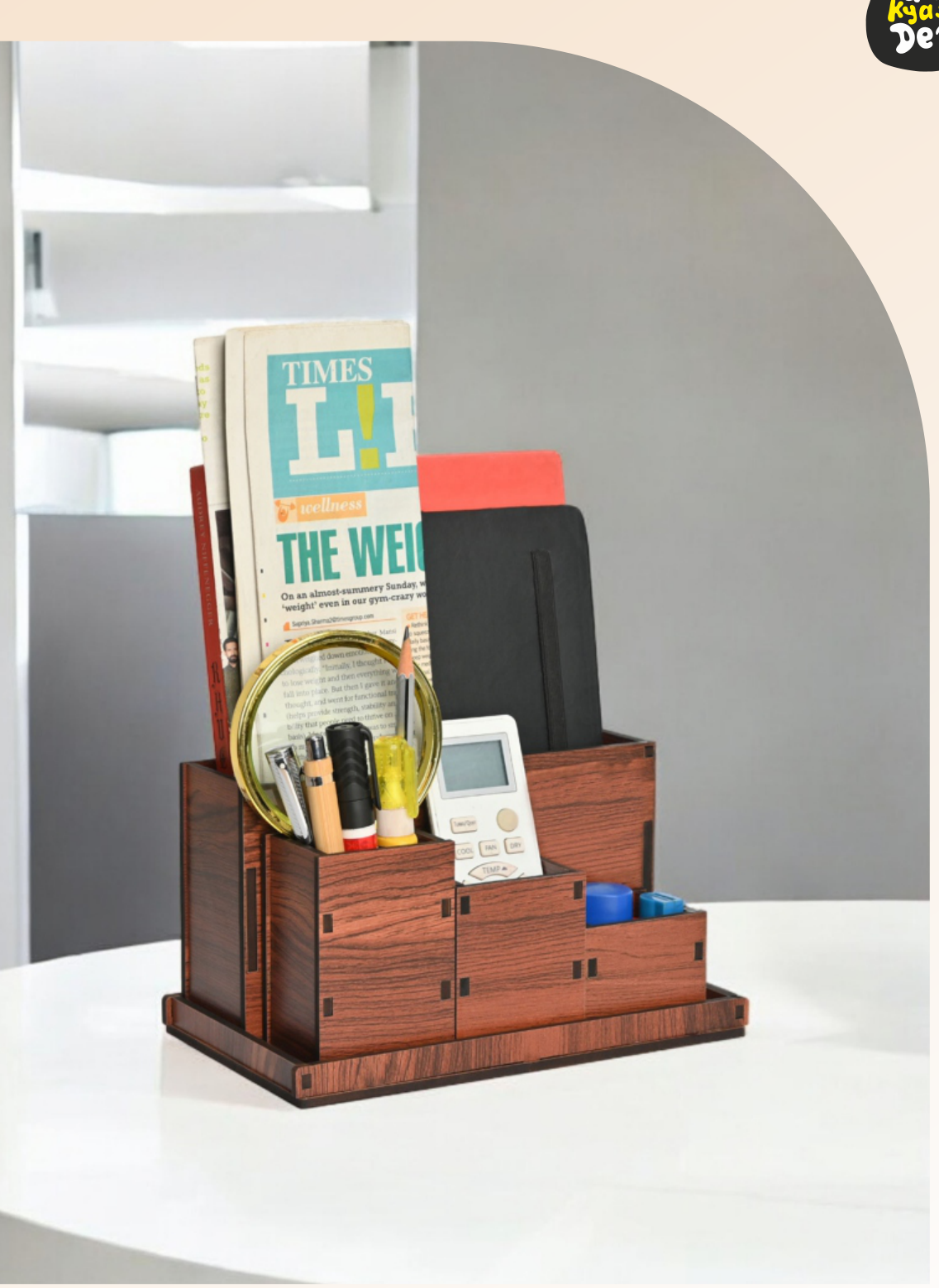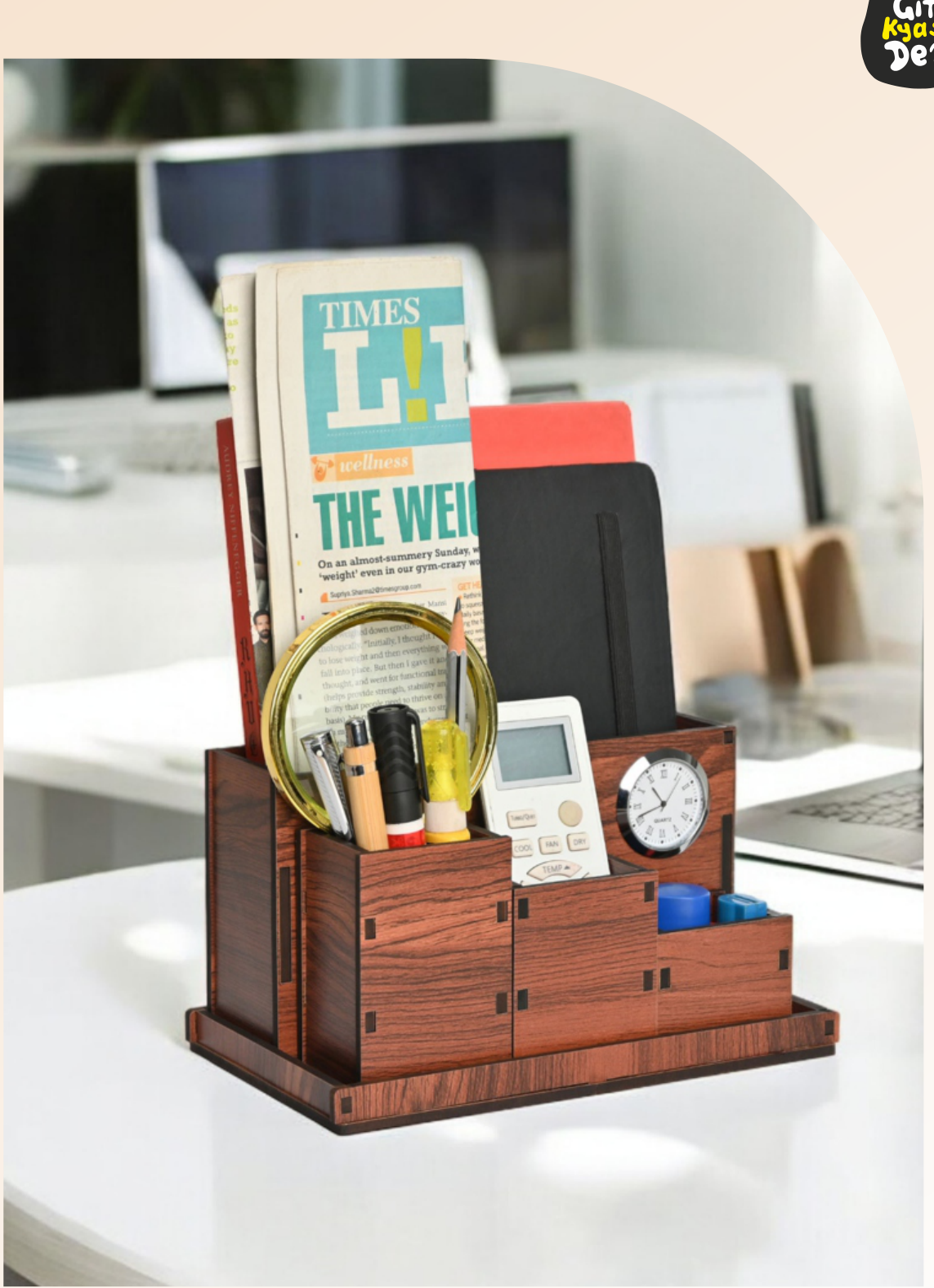 This wooden desk organizer features multiple compartments for pens, notebooks, and other office supplies. It includes a built-in clock and a magnifying glass, adding both functionality and a classic aesthetic to your workspace. Keep your desk tidy and stylish with this practical organizer.