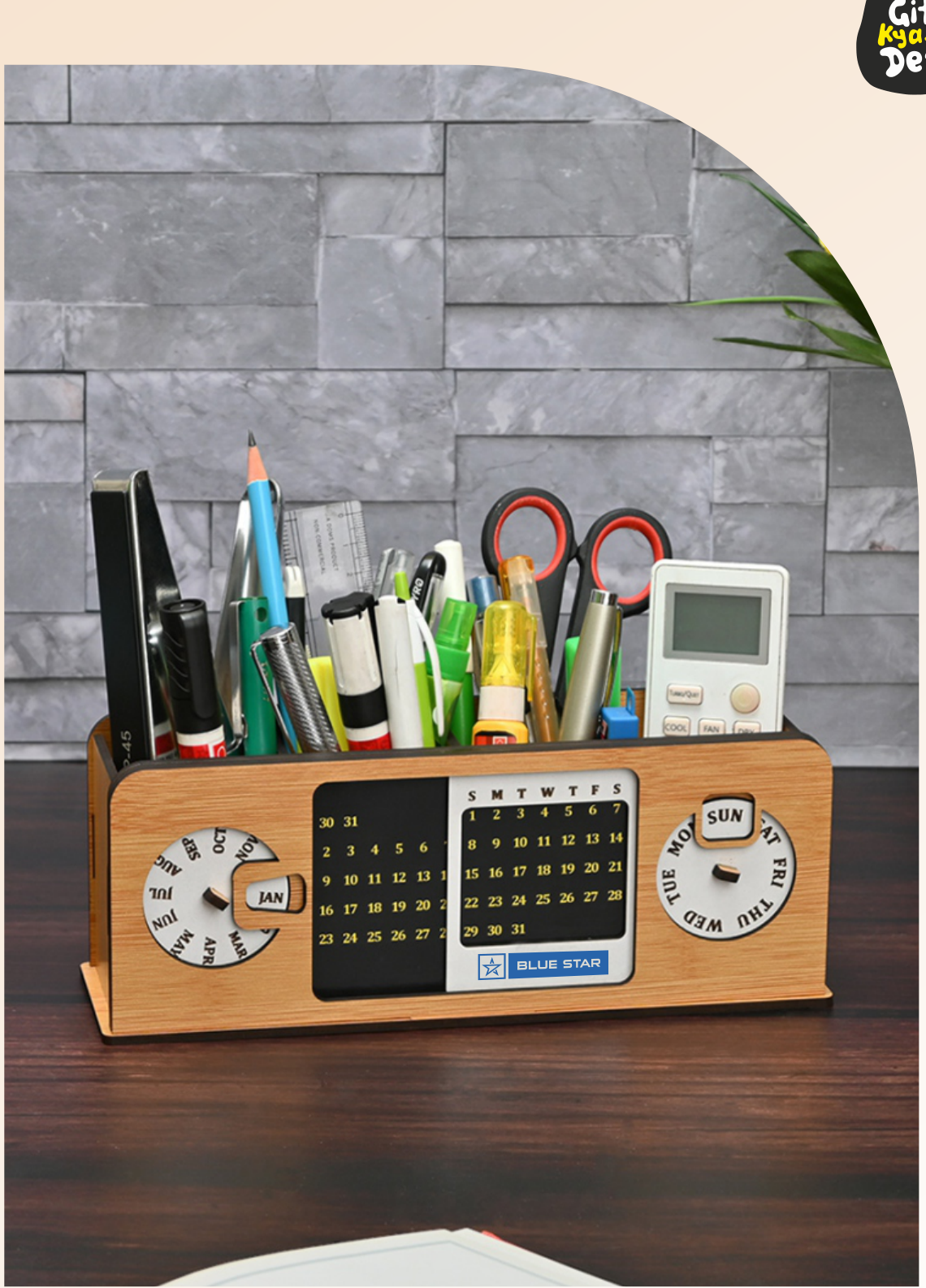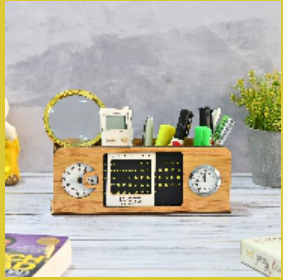 This wooden desk organizer features two functional clocks, a central photo frame slot, and multiple compartments for pens, pencils, and other office supplies. Its rustic design adds a touch of charm to any workspace.