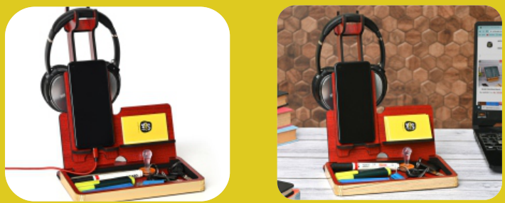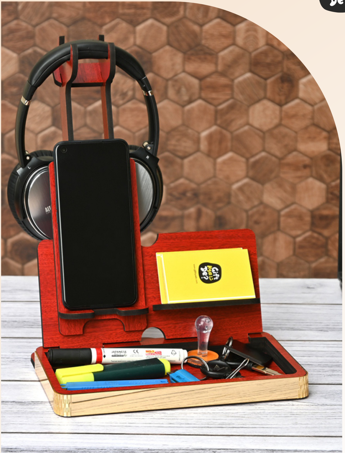 Features: Headphone Stand, Phone Holder, Compartments for stationery and keys, Business card holder