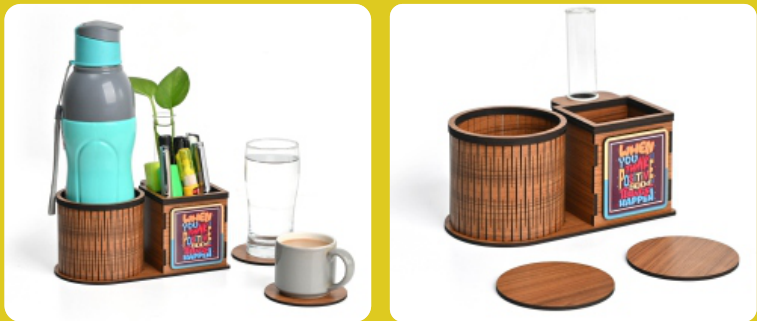 This wooden desk organizer features a practical design to keep your workspace tidy. It includes a dedicated section for pens and stationery, along with a holder for a water bottle. The natural wood finish adds a touch of warmth to any desk.