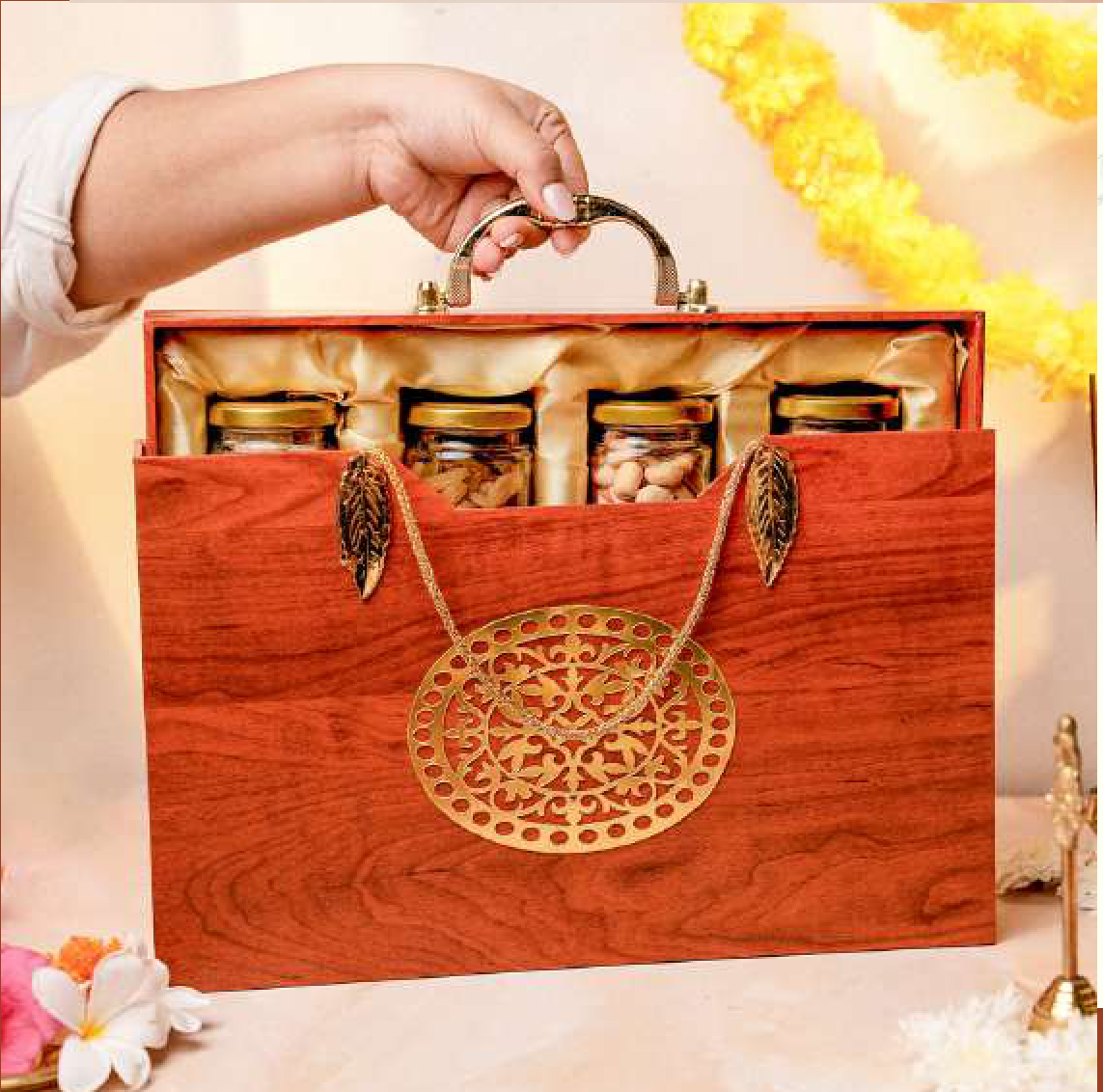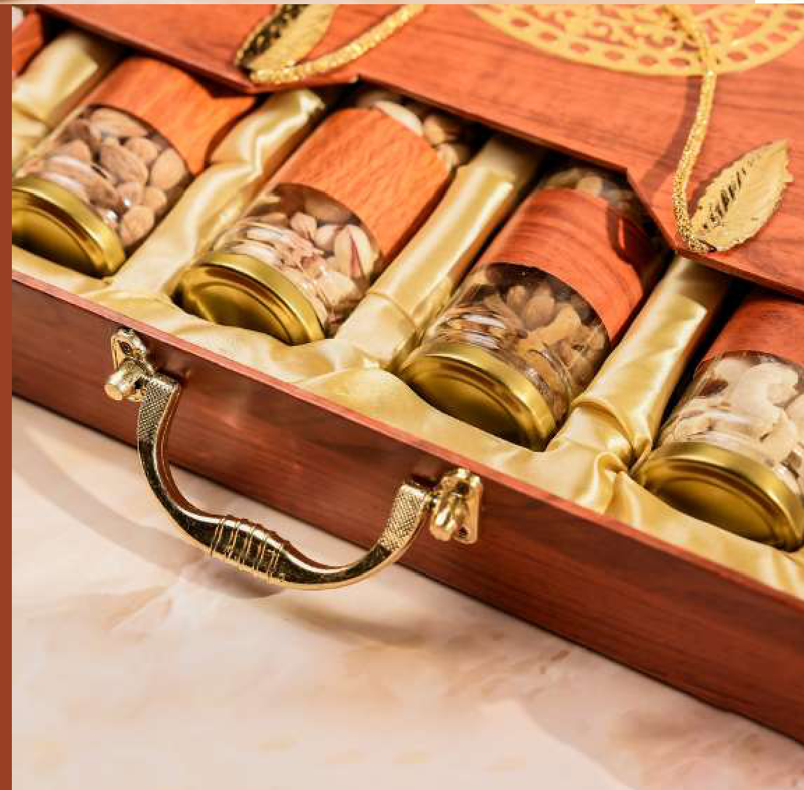 An elegant wooden gift box designed for presenting special treats. It features four glass jars with golden lids, perfect for dry fruits or sweets. The box is adorned with a decorative golden pendant and leaf motifs, adding a touch of luxury.