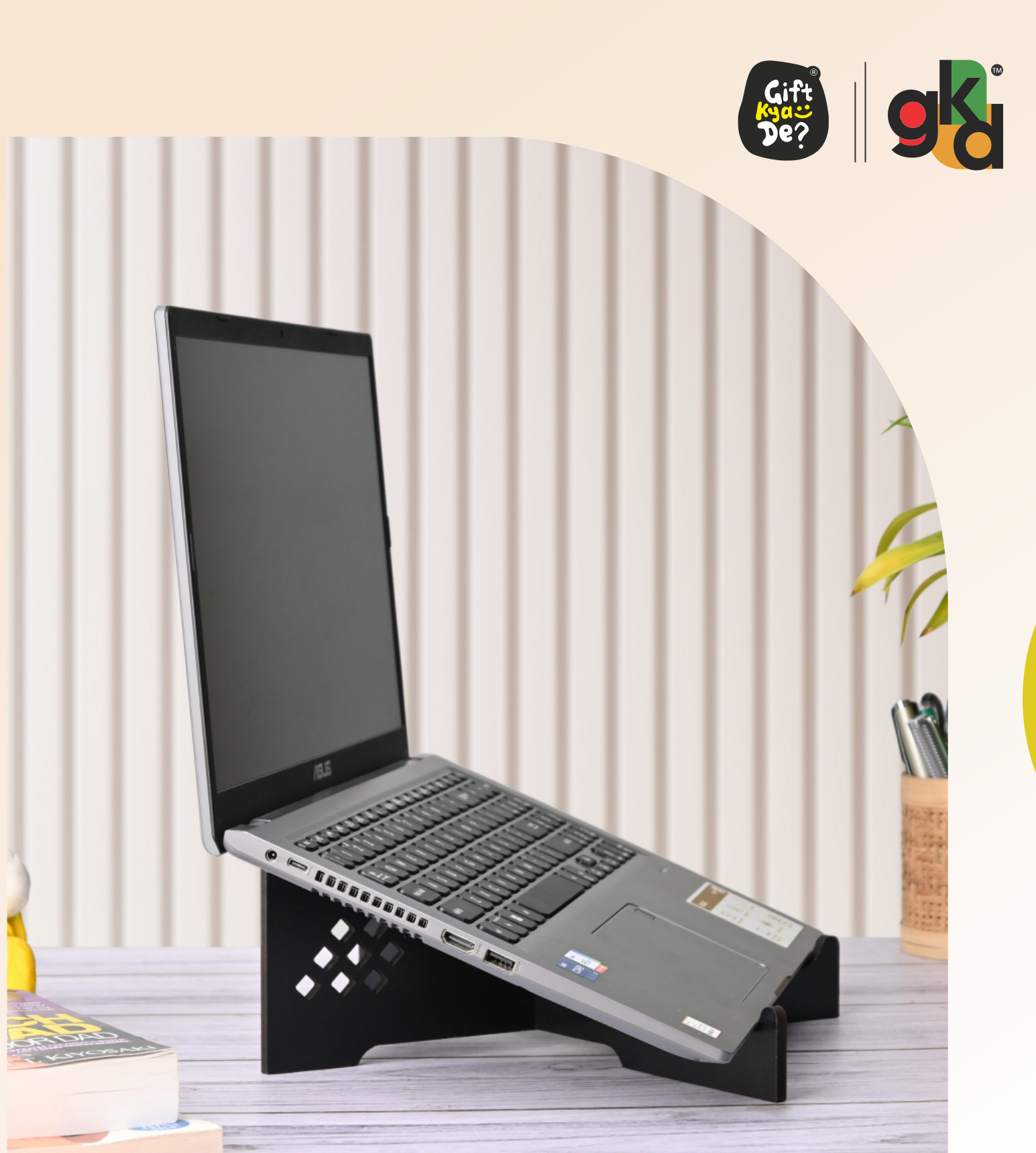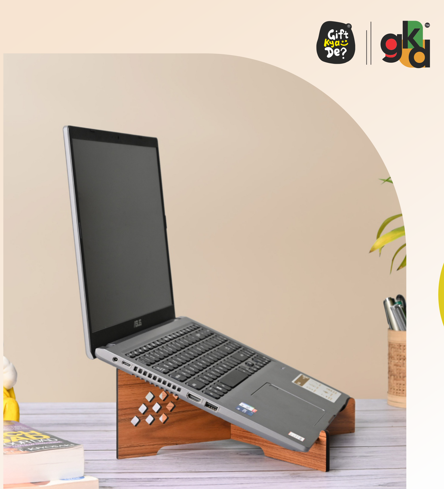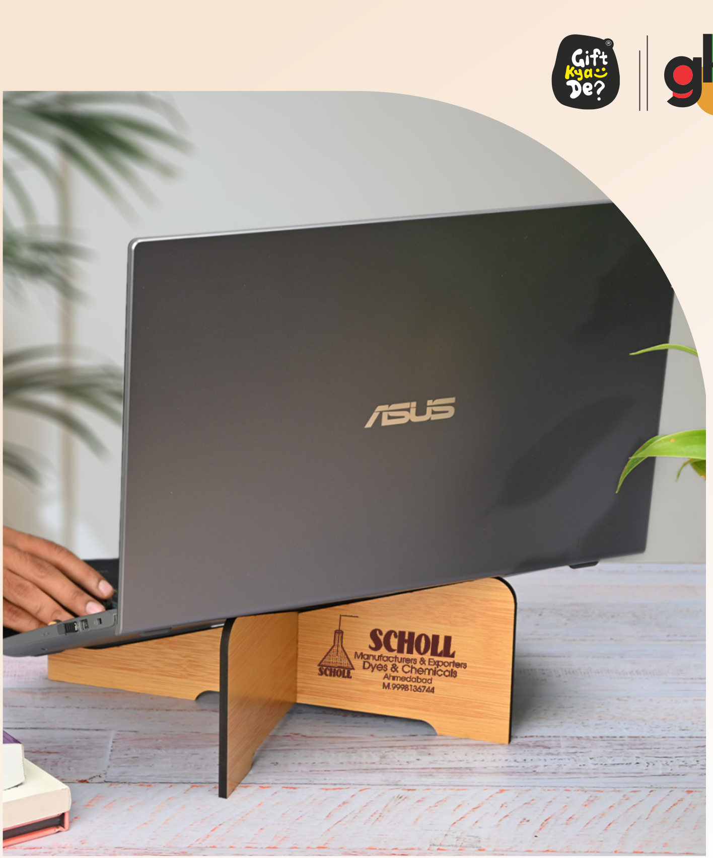 Elevate your workspace with this stylish wooden laptop stand. Featuring a modern geometric cutout design, it provides optimal viewing angles and improved airflow for your laptop. Crafted from durable wood, it adds a touch of natural elegance to any desk.