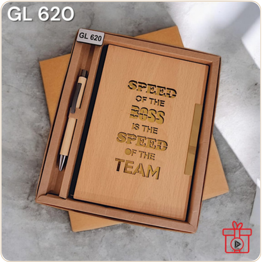This elegant gift set features a wooden notebook with the motivational quote "Speed of the boss is the speed of the team" laser-cut into the cover. It also includes a matching wooden pen, making it a perfect executive gift or corporate giveaway.