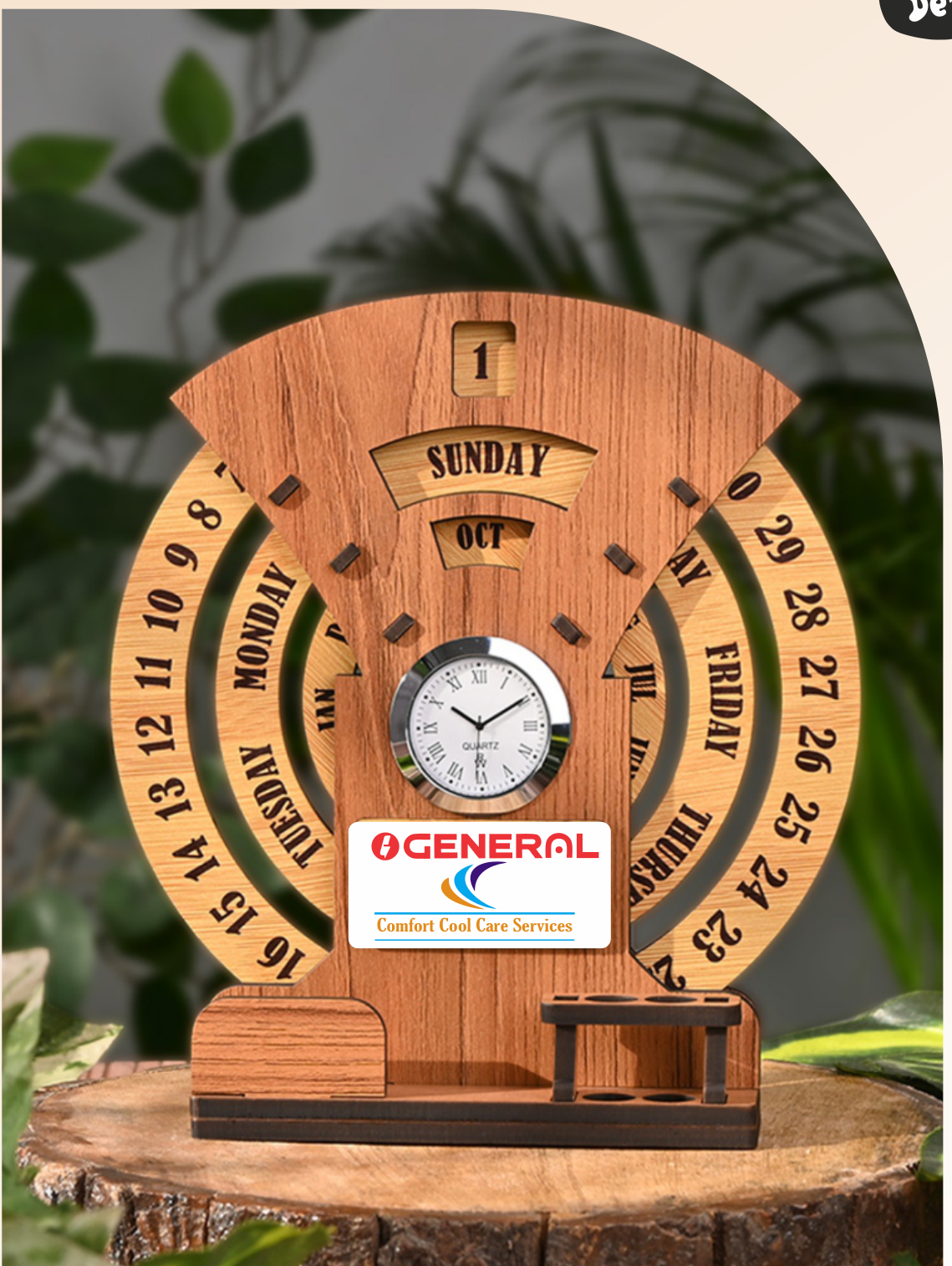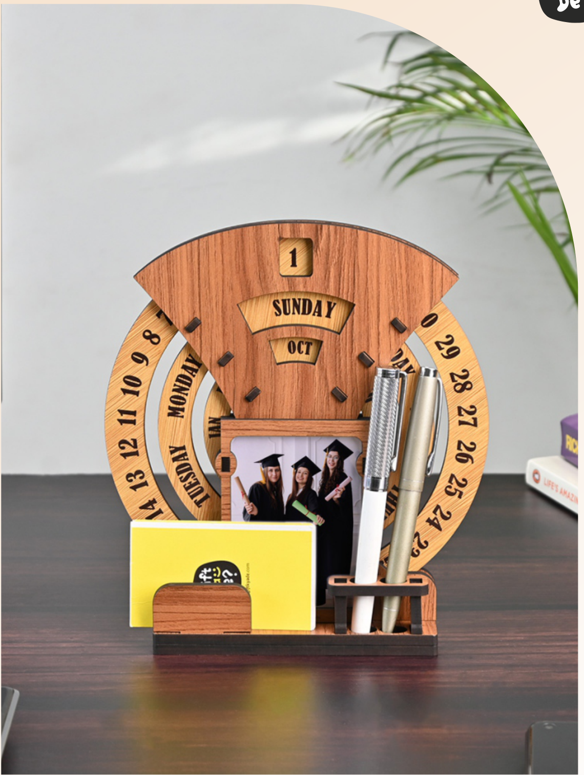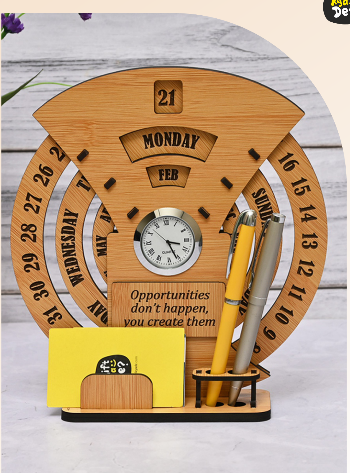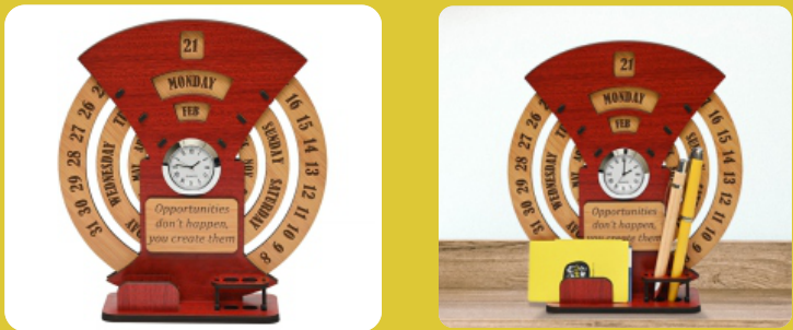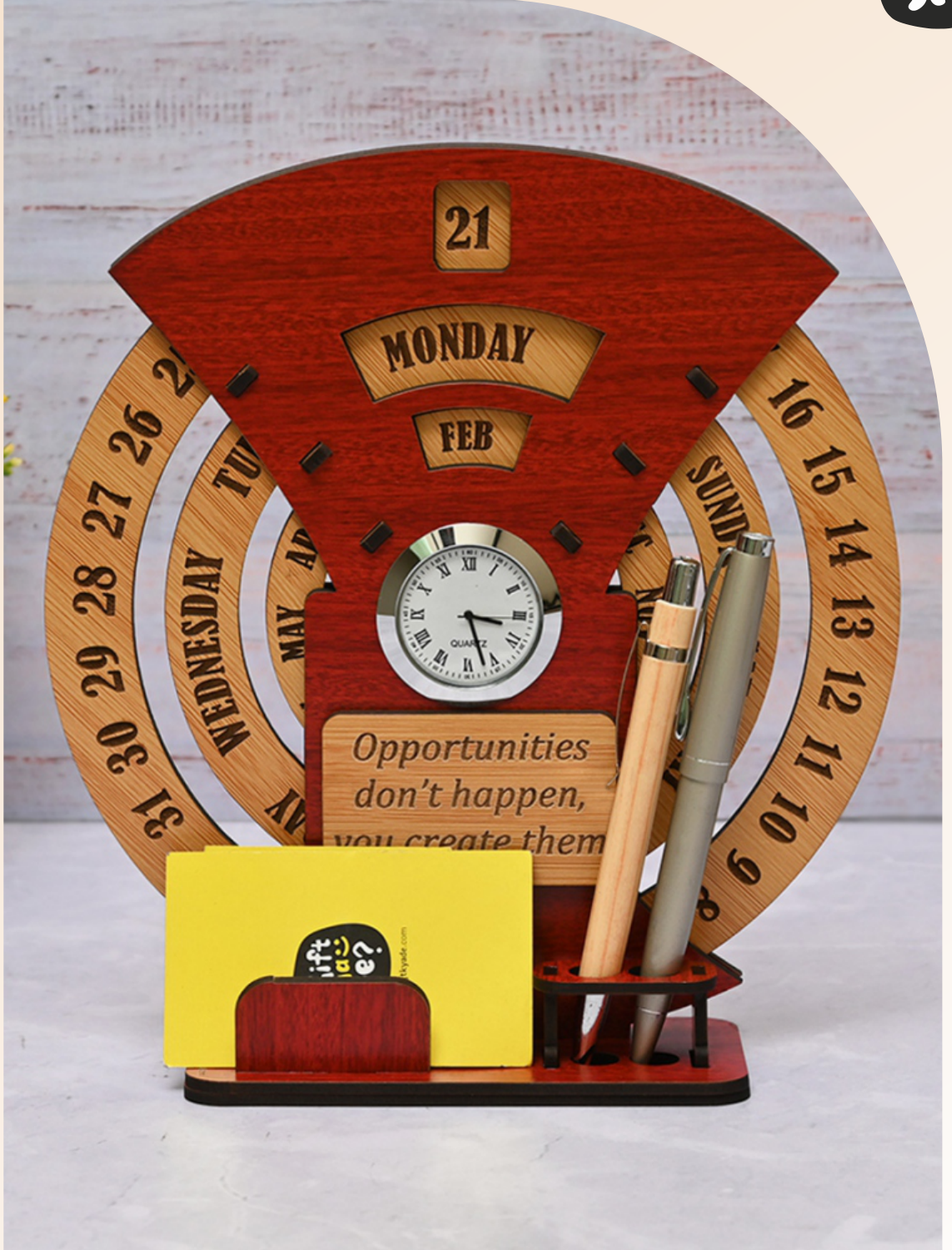 Features: Perpetual Calendar, Clock, Pen Holder, Motivational Quote, Wooden Construction
