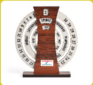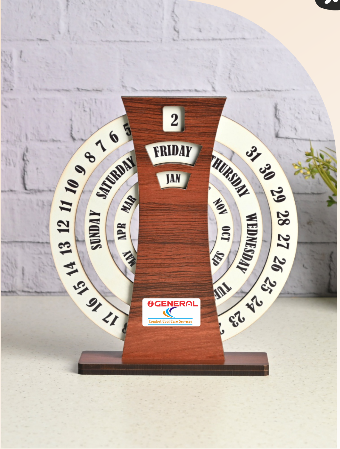 Features: Rotating discs for date, day, and month, Wooden base, Branding logo