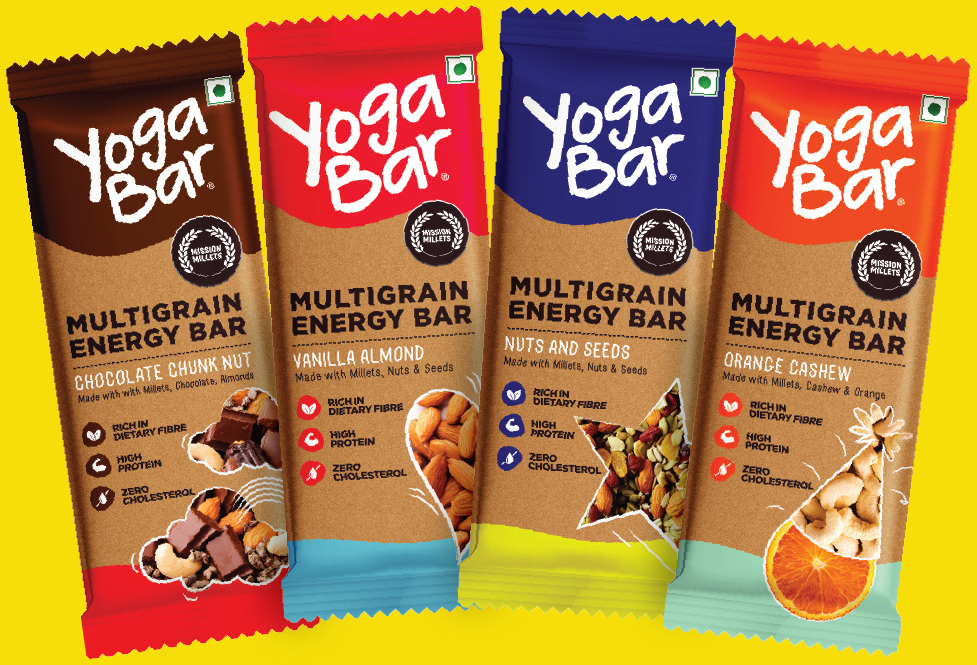 A selection of Yoga Bar Multigrain Energy Bars, offering delicious and nutritious options for an on-the-go snack. These bars are made with millets, nuts, and seeds, and are rich in dietary fibre, high in protein, and contain zero cholesterol.
