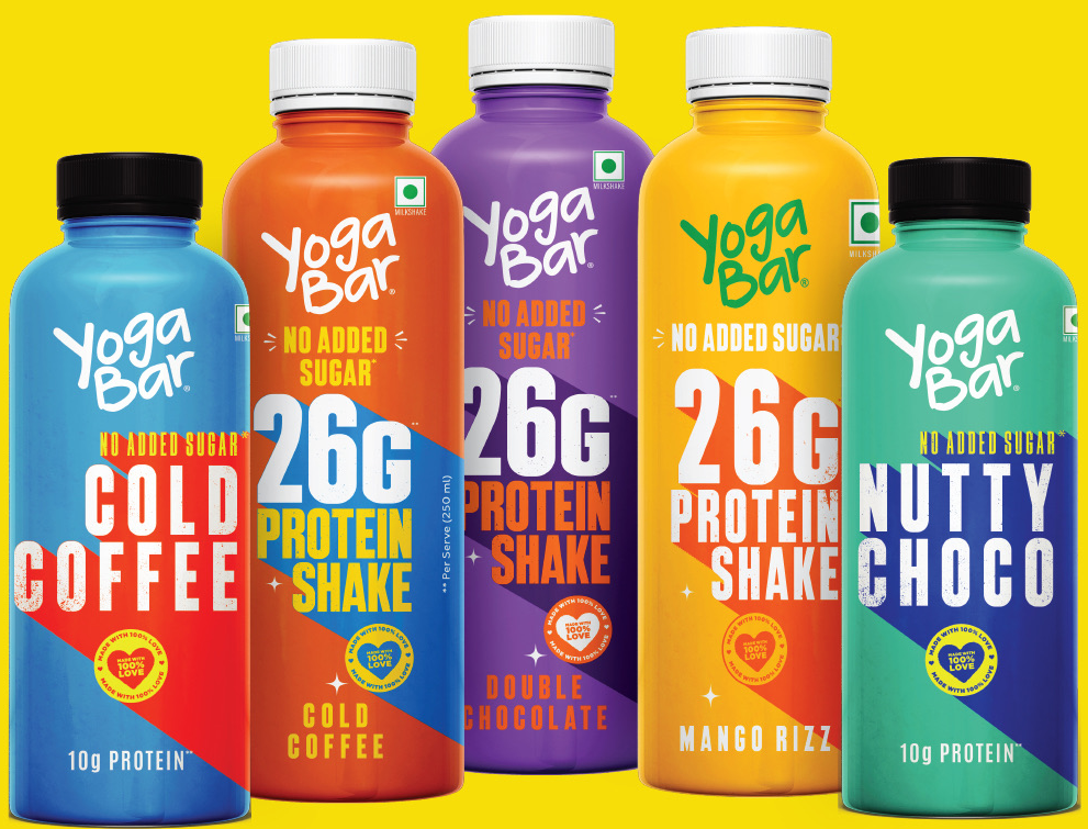 A range of Yoga Bar protein shakes, offering 26g of protein per serving with no added sugar. Available in various flavors like Cold Coffee, Double Chocolate, and Mango Rizz, these drinks are made with 100% love for a healthy lifestyle.