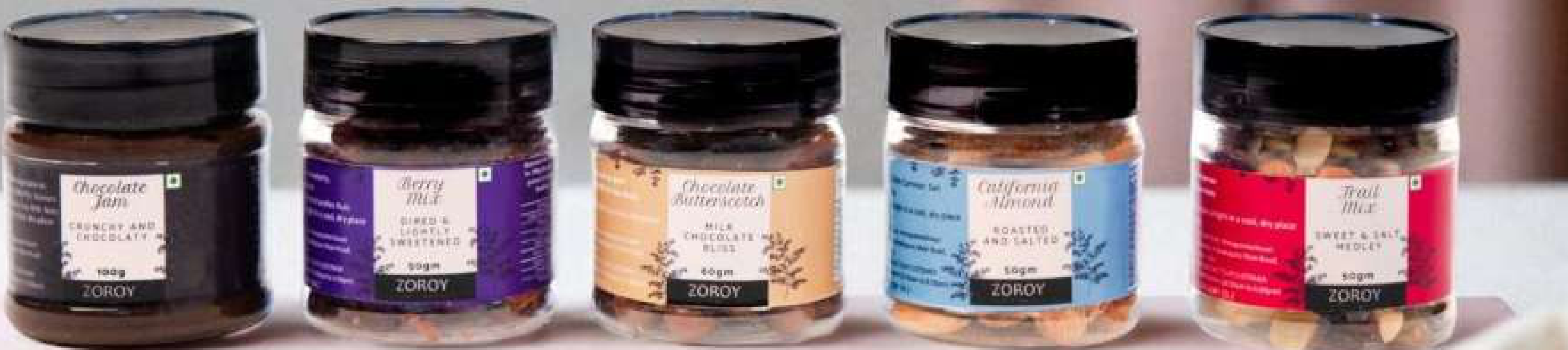 A collection of delicious jar snacks from Zoroy, featuring flavors like Chocolate Jam, Berry Mix, Chocolate Butterscotch, California Almond, and Trail Mix. Perfect for a quick and satisfying snack.