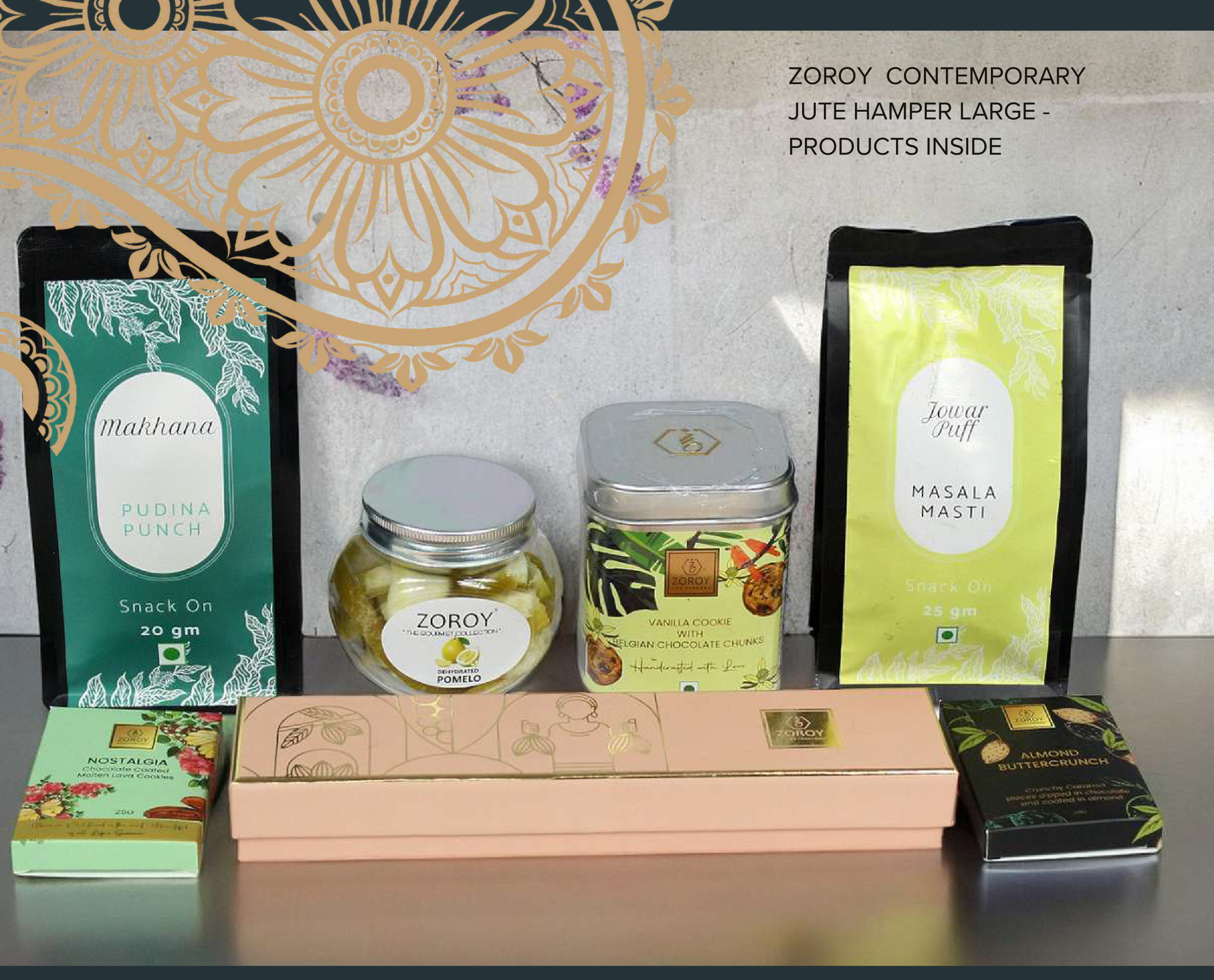 This large contemporary jute hamper from Zoroy is filled with a curated selection of gourmet treats. It includes various snacks and cookies, perfect for gifting or personal indulgence. The hamper is designed with a sophisticated aesthetic, making it a premium choice for any occasion.