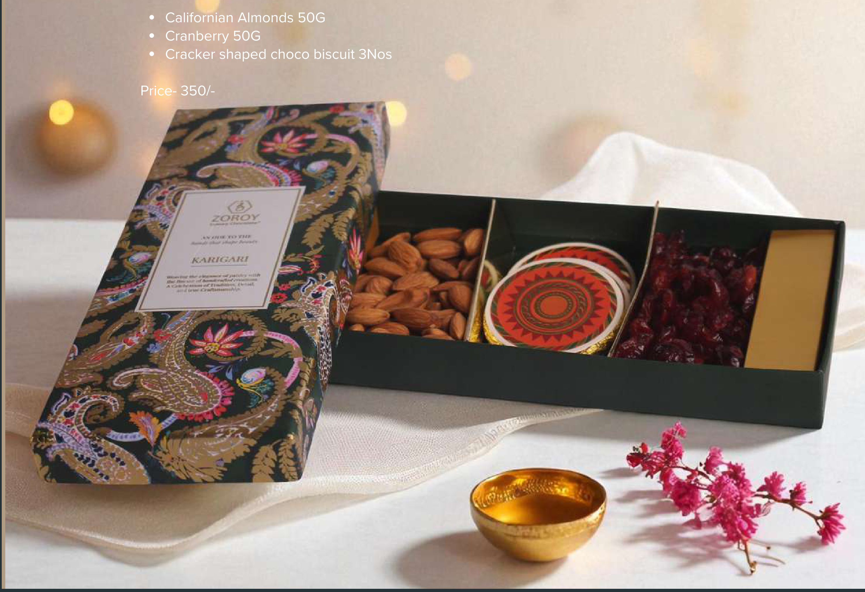 Zoroy Karigari Gift Box with Almonds, Cranberries, and Choco Biscuits