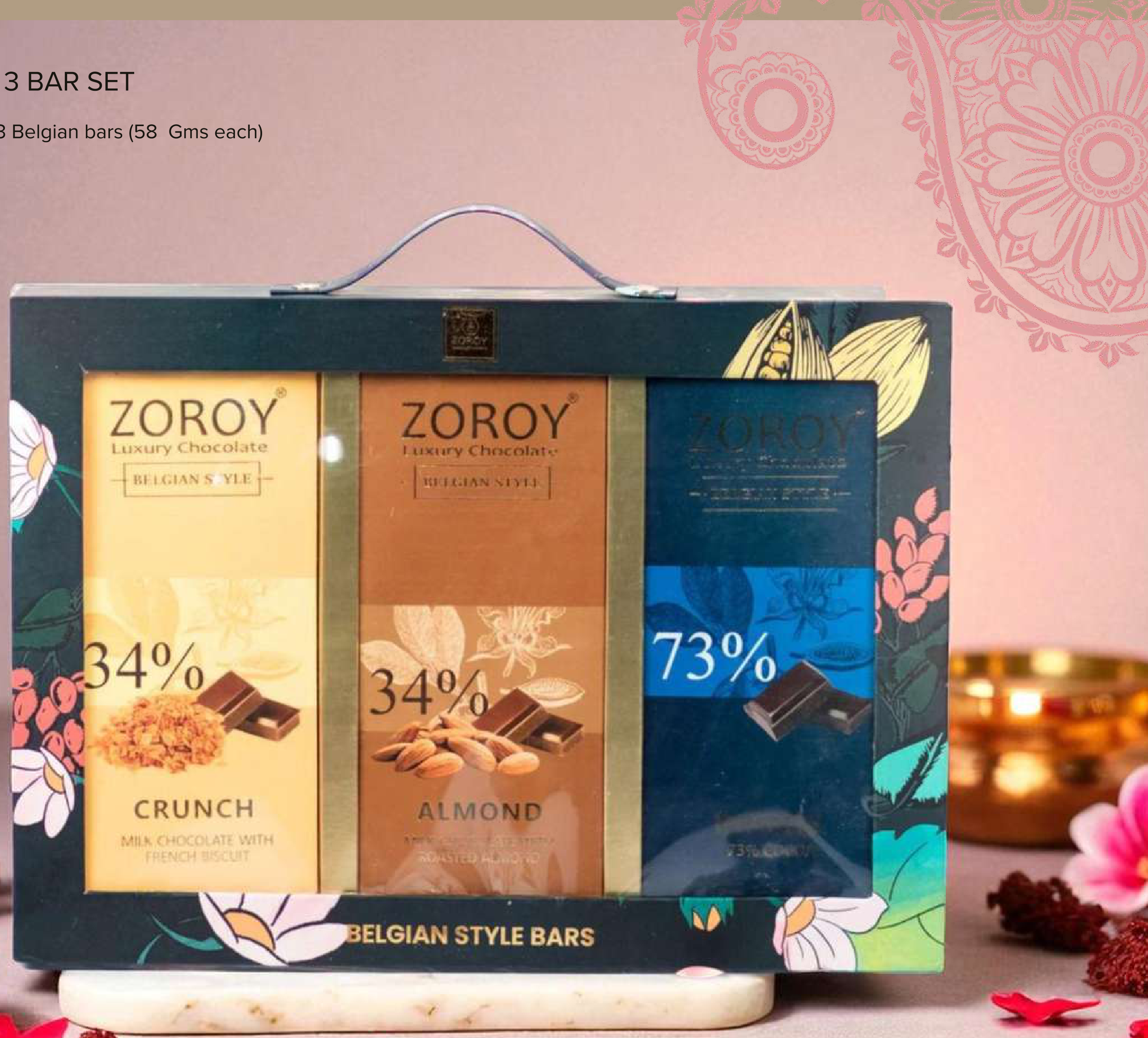 Experience the exquisite taste of Zoroy Luxury Chocolate with this 3-bar set of Belgian-style chocolates. Each bar is crafted with premium ingredients, offering a delightful indulgence for any chocolate connoisseur. This set features a variety of flavors including Crunch Milk Chocolate, Almond, and 73% Cocoa.