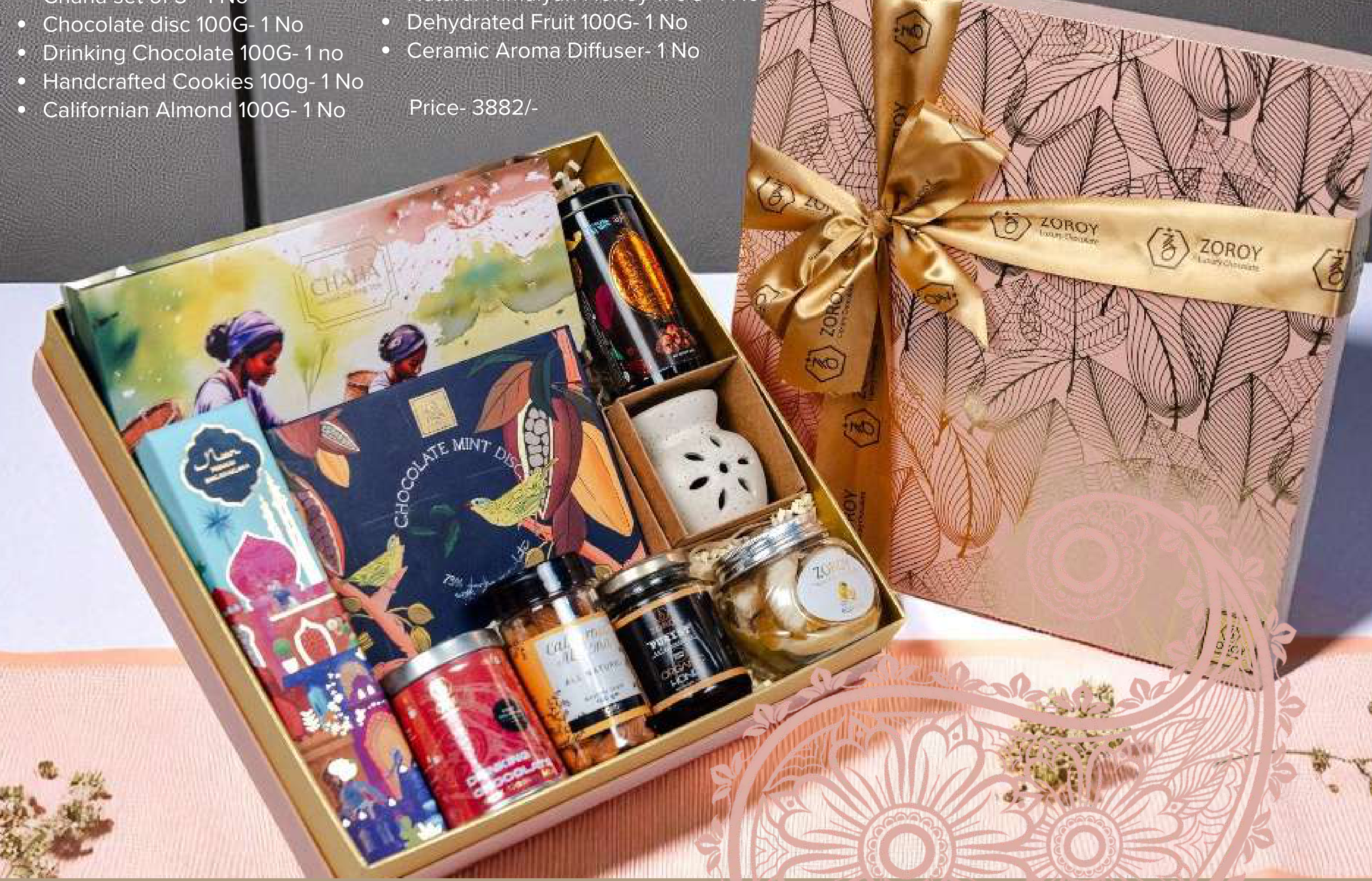 An exquisite gift box featuring a selection of premium chocolates, including chocolate discs, drinking chocolate, handcrafted cookies, and Californian almonds. It also includes dehydrated fruits and a ceramic aroma diffuser, making it a perfect indulgence for any occasion.
