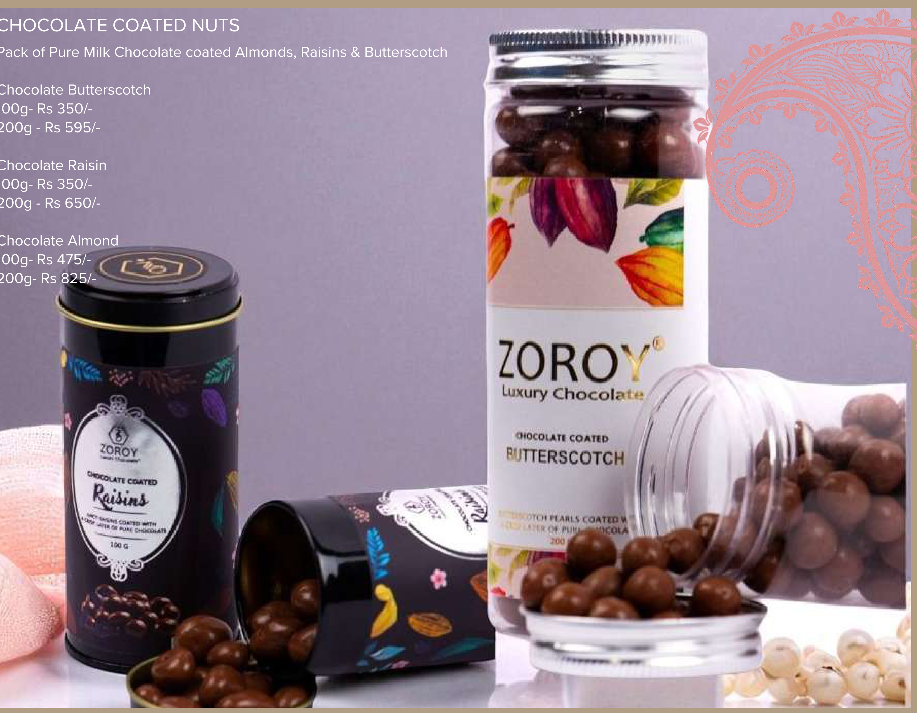 Indulge in a delightful assortment of pure milk chocolate coated nuts, featuring crunchy almonds, sweet raisins, and rich butterscotch pearls. Available in convenient sizes for a perfect treat or gift.