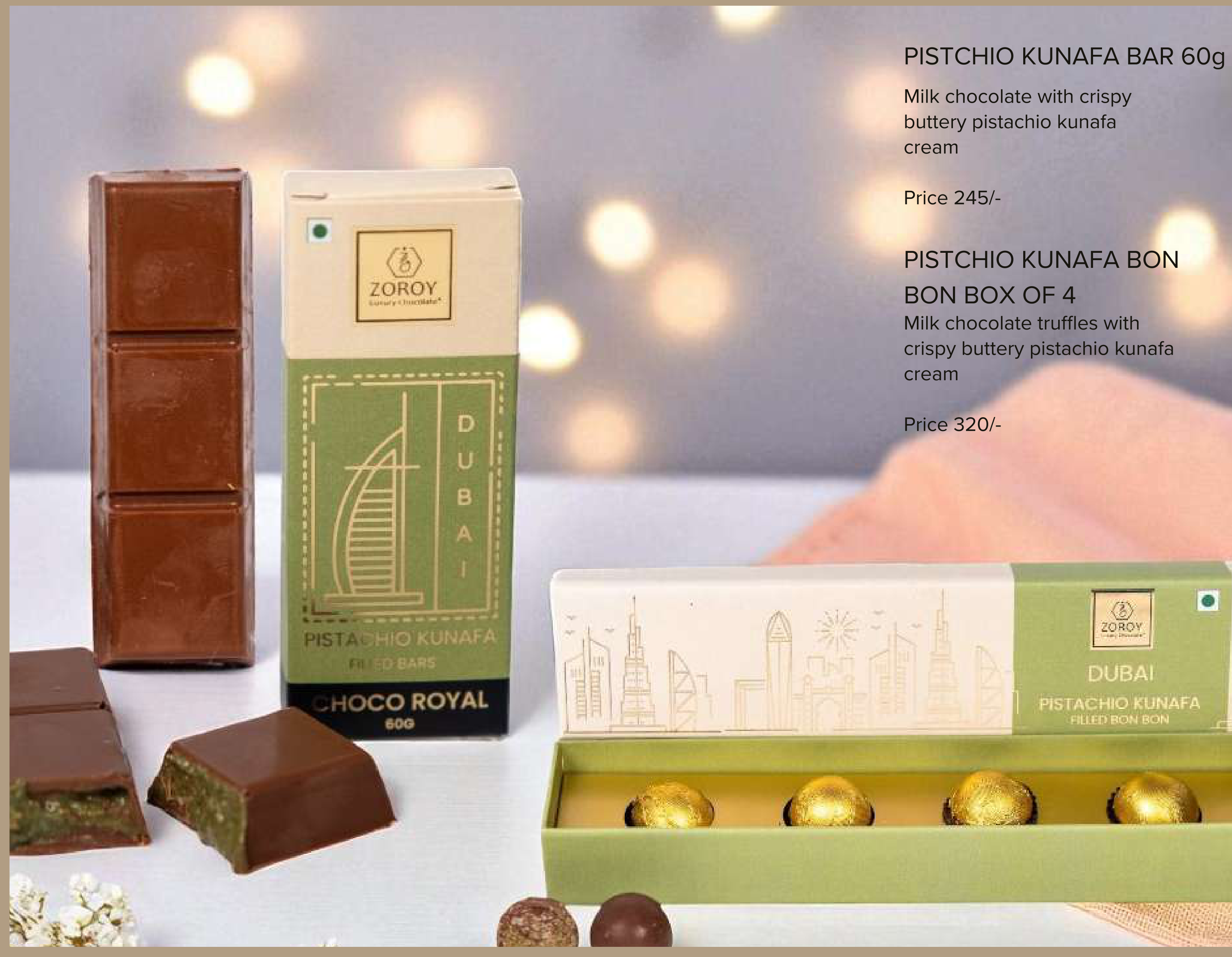 Zoroy Pistachio Kunafa Chocolate Bar and Bon Bon Box