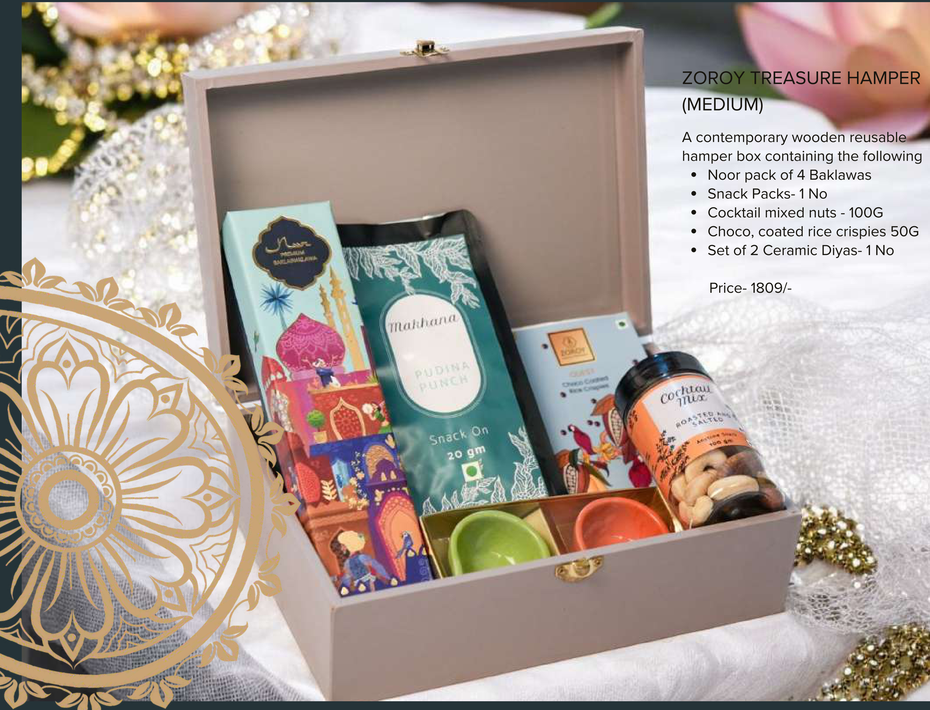 A contemporary wooden reusable hamper box filled with a selection of gourmet treats. This medium-sized hamper includes a Noor pack of 4 Baklawas, snack packs, cocktail mixed nuts, choco-coated rice crispies, and a set of 2 ceramic diyas.